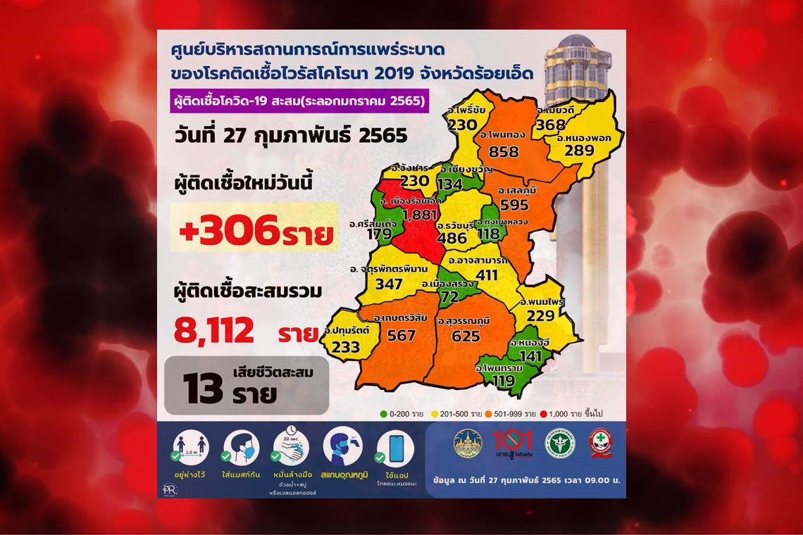 วันที่ 27 กุมภาพันธ์ 2565 นายแพทย์ปิติ ทั้งไพศาล นพ.สสจ.ร้อยเอ็ด มอบหมายให้ จนท.รายงานสถานการณ์ไวรัสโคโรนา 2019 COVID-19 จังหวัดร้อยเอ็ด พบผู้ติดเชื้อรายใหม่ วันนี้ (ระลอก มกราคม 2565)จาก18อำเภอ 306 ราย ผู้ป่วยสะสม 8,112 รายรักษาหาย 334 ราย คงพยาบาล 2,460 ราย เสียชีวิต 0 ราย เสียชีวิตสะสม 13 ราย ยอดผู้ป่วยโควิด 19 ยืนยันสะสม ในจังหวัดร้อยเอ็ด ยอดสะสม 21,886 ราย เสียชีวิตสะสม 131 ราย