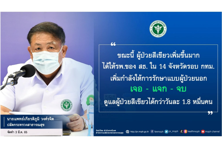 วันนี้ (3 มีนาคม 2565) ที่ศูนย์แถลงข่าวสถานการณ์โรคติดเชื้อไวรัสโคโรนา 2019 กระทรวงสาธารณสุข จ.นนทบุรี นพ.เกียรติภูมิ วงศ์รจิต ปลัดกระทรวงสาธารณสุข พร้อมด้วย นพ.ธงชัย กีรติหัตถยากร รองปลัดกระทรวงสาธารณสุข แถลงข่าวการขยายบริการ “เจอ แจก จบ” รับผู้ป่วยโควิด 19 กลุ่มสีเขียวที่เพิ่มมากขึ้น ว่า จากข้อมูลสายด่วน สปสช. 1330 วันที่ 2 มีนาคม 2565 มีการโทรเข้าถึง 70,300 สาย ติดต่อเจ้าหน้าที่ 59,614 สาย เจ้าหน้าที่รับสายได้ 29,688 สาย ที่เหลืออีกประมาณ 30,000 สาย ต้องรอสายนานหรือไม่ได้รับการติดต่อกลับ เพื่อบรรเทาความเดือดร้อนของผู้ติดเชื้อโควิด 19 พื้นที่ กทม.ที่ยังติดต่อ 1330 ไม่ได้หรือรอคอยนาน กระทรวงสาธารณสุขจึงสั่งการให้โรงพยาบาลในสังกัด 14 จังหวัดรอบ กทม. ได้แก่ นนทบุรี, ปทุมธานี, พระนครศรีอยุธยา, สระบุรี, นครนายก, สิงห์บุรี, อ่างทอง, นครปฐม, สมุทรสงคราม, สมุทรสาคร, สุพรรณบุรี, สมุทรปราการ, ชลบุรี, ฉะเชิงเทรา, โรงพยาบาลสังกัดกรมสุขภาพจิตและสังกัดกรมควบคุมโรค เพิ่มศักยภาพให้การดูแลแบบผู้ป่วยนอก “เจอ แจก จบ” ให้เพิ่มขึ้น เริ่มตั้งแต่วันที่ 4 มีนาคม 2565 เป็นต้นไป รองรับบริการได้ประมาณ 18,650 รายต่อวัน