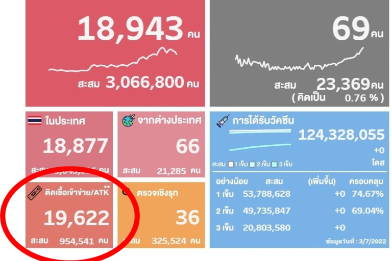 กรมควบคุมโรค กระทรวงสาธารณสุข รายงานข้อมูลผลการตรวจ ATK ประจำวันที่ 8 มี.ค.65 เวลา 07.23 น. โดยพบ ATK เป็นบวกเพิ้มอีก 19,622 ราย สูงกว่าจำนวนผู้ติดเชื้อรายใหม่ที่มีการรายงานอยู่ที่ 18,943 ราย จึงทำให้ผู้ติดเชื้อรายใหม่อย่างไม่เป็นทางการอยู่ที่ 38,565 ราย
