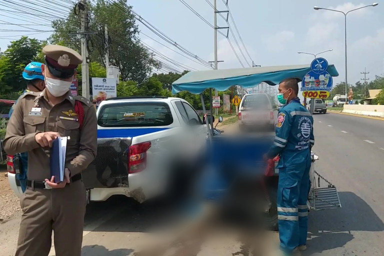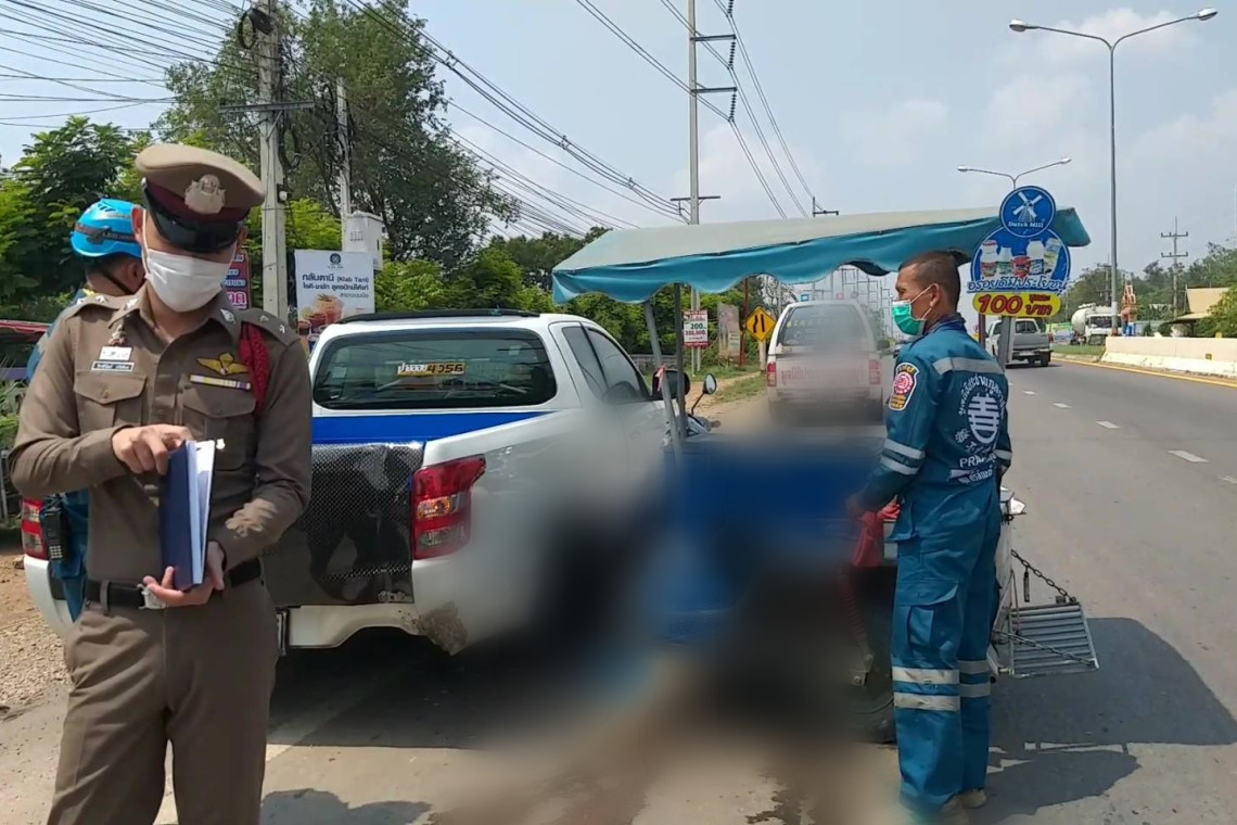 ในวันนี้(10 มี.ค. 65) ร.ต.ท.จิราธิวัฒน์ สวัสดิผล ร้อยเวรสภ.เมืองราชบุรี จ.ราชบุรี ได้รับแจ้งเหตุรถจักรยานยนต์พ่วงข้าง ชนท้ายรถปิกอัพ มีผู้เสียชีวิตในที่เกิดเหตุ 1 ราย เหตุเกิดที่บริเวณ ถนนสายราชบุรี - จอมบึง หมู่ 15 ต.เกาะพลับพลา อ.เมือง จึงเดินทางไปตรวจสอบพร้อมแพทย์เวรโรงพยาบาลราชบุรี และเจ้าหน้าที่มูลนิธิประชานุกูลราชบุรี ในที่เกิดเหตุ พบรถปิกอัพ ยี่ห้อ มิตซูบิชิ สีขาว หมายเลขทะเบียนนครปฐม จอดอยู่ริมถนน ส่วนที่ด้านท้ายรถด้านขวา มีร่องรอยถูกเฉี่ยวชนจนบุบ และที่ซุ้มล้อหลังด้านขวาพบรถจักรยานยนต์ดัดแปลงแบบพ่วงข้าง ยี่ห้อ ฮอนด้า เวฟ สีดำ หมายเลขทะเบียนกทม. ล้อชนอัดติดอยู่กับซุ้มล้อ และที่ตัวพ่วงมีร่องรอยยุบเข้าไปจนถึงถังสำหรับใส่นมเปรี้ยว ยี่ห้อ หนึ่ง ส่วนผู้เสียชีวิตกระเด็นห่างรถไปประมาณ 5 เมตร ทราบชื่อคือสาวอายุ 43 ปี อยู่ซอยพระยาสุเรนทร์ 14 แขวงบางชัน เขตคลองสามวา กรุงเทพฯ ซึ่งเป็นแม่ค้าขายส่งนมเปรี้ยว ยี่ห้อหนึ่ง สภาพศพที่ศรีษะมีบาดแผลฉกรรจ์
