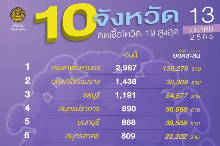 ศูนย์ข้อมูลโควิด-19 รายงานสถานการณ์โรคติดเชื้อไวรัสโควิด-19 ข้อมูล ณ วันที่ 13 มี.ค.65 เวลา 01.00 น. พบว่าประเทศไทยยังคงพบผู้ติดเชื้อรายใหม่ในทั้ง 77 จังหวัด โดย 10 อันดับจังหวัดที่มีผู้ติดเชื้อสูงสุด กทม.ยังคงยืนอันดับ 1 ผู้ติดเชื้อรายใหม่และยอดสะสมสูงสุด ทั้งนี้ พบมี 4 จังหวัดที่มีตัวเลขผู้ติดเชื้อรายใหม่เพิ่มขึ้น โดยต้องจับตาอันดับ 2 วันนี้ นครศรีธรรมราช ที่แซงชลบุรีหล่นไปอันดับ 3 ตัวเลขผู้ติดเชื้อเพิ่มขึ้นมากอยู่ที่ 1,438 ราย (จากเมื่อวาน 1,148 ราย) อันดับ 6 สมุทรสาคร 809 ราย (จาก 767 ราย) อันดับ 7 พระนครศรีอยุธยา 768 ราย (จาก 675 ราย) อันดับ 9 นครราชสีมา 556 ราย (จาก 438 ราย) สำหรับจังหวัดที่พบผู้ติดเชื้อรายใหม่น้อยที่สุดคือ ลำพูน 6 ราย