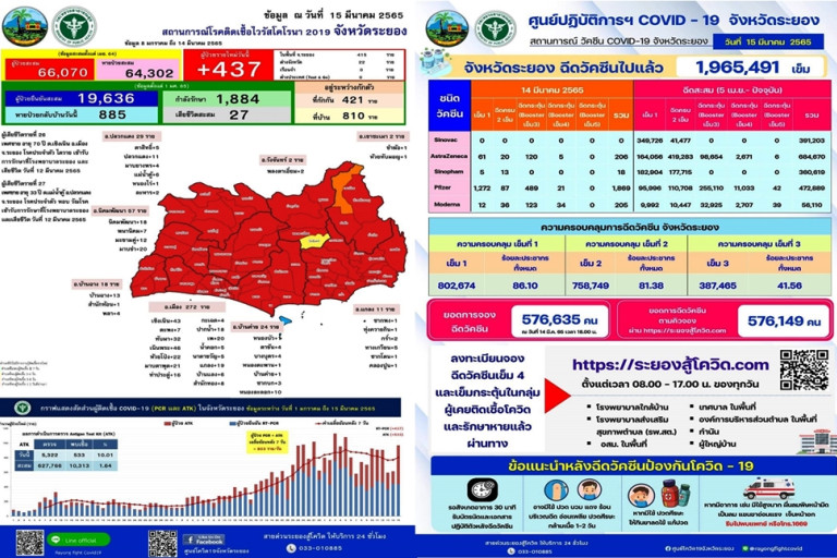 วันที่ 15 มี.ค.65 ศูนย์ปฏิบัติการฯ โควิด-19 ระยอง รายงานสถานการณ์การแพร่ระบาดโควิด-19 ของจังหวัดระยองว่า วันนี้พบผู้ติดเชื้อโควิดเสียชีวิต 3 ราย รายแรกเป็นเพศชาย อายุ 70 ปี ชาว ต.เชิงเนิน อ.เมืองระยอง มีโรคประจำตัว ไตวาย เข้ารักษาตัว รพ.ระยอง วันที่ 12 มี.ค.ก่อนจะเสียชีวิต อีกรายเป็นเพศชาย อายุ 33 ปี ชาวต.แม่น้ำคู้ อ.ปลวกแดง มีโรคประจำตัว หอบ วัณโรค เข้ารับการรักษาตัวที่ รพ.ระยอง เสียชีวิตวันที่ 12 มี.ค.ก่อนจะเสียชีวิตในวันเดียวกัน ทำให้มียอดผู้ติดเชื้อเสียชีวิตสะสมระลอกใหม่เพิ่มเป็น 27 รายแล้ว ส่วนผู้ติดเชื้อรายวันพบเพิ่ม 437 ราย ผู้ติดเชื้อสะสมละลอกใหม่เพิ่มเป็น 66,070 ราย หายป่วยแล้ว 64,302 ราย โดยพบผู้ติดเชื้อทั้ง 8 อำเภอ โดยพบสูงสุดอยู่ใน อ.เมืองระยอง 272 ราย รองลงมามี อ.นิคมพัฒนา 57 ราย อ.ปลวกแดง 29 ราย อ.บ้านค่าย 24 ราย อ.บ้านฉาง 18 ราย อ.แกลง 11 ราย อ.วังจันทร์ และ อ.เขาชะเมา อำเภอละ 2 ราย ต่างจังหวัดเข้ามารักษาตัว 22 ราย ยอดฉีดวัคซีนไปแล้ว 1965,491 เข็ม