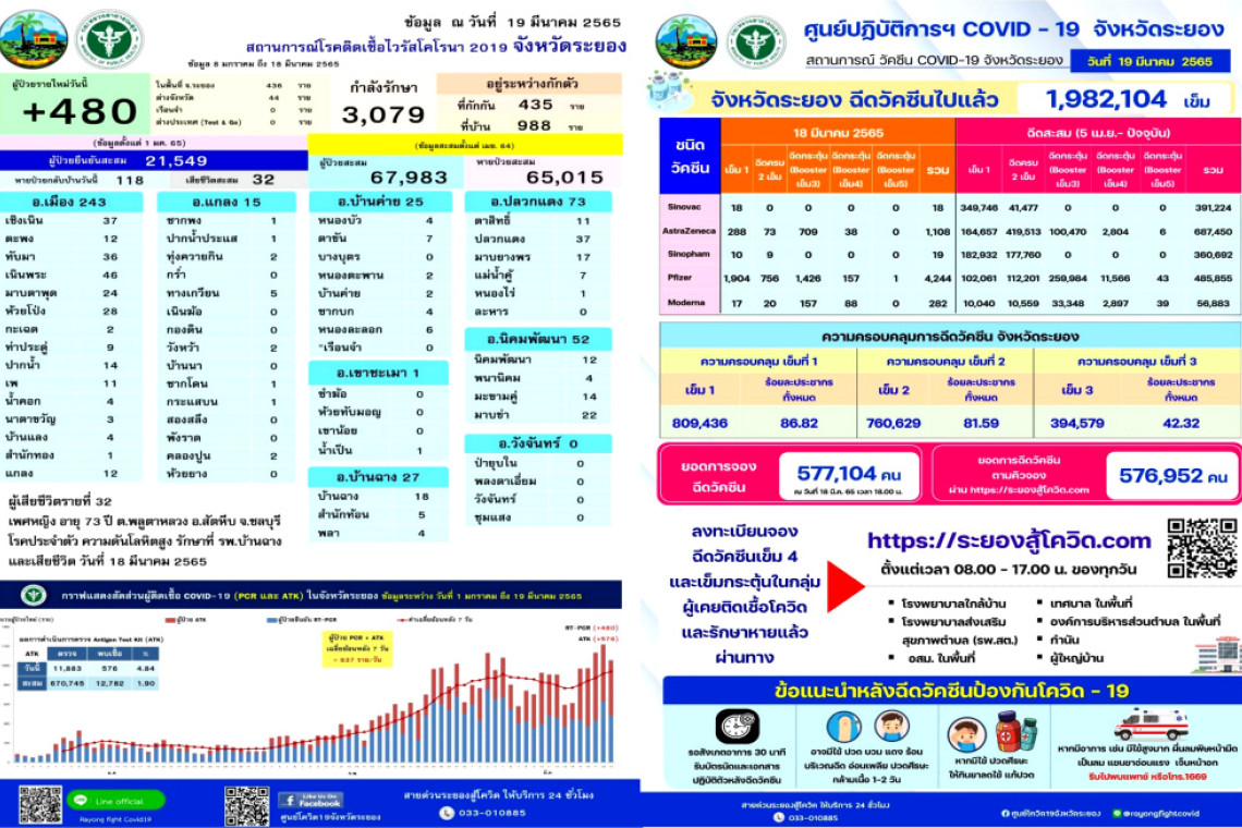 วันที่ 19 มี.ค.65 ศูนย์ปฏิบัติการฯ โควิด-19 ระยอง รายงานสถานการณ์การแพร่ระบาดโควิด-19 ของจังหวัดระยองว่า วันนี้พบผู้ติดเชื้อโควิดเสียชีวิต 1 ราย เป็นเพศหญิง อายุ 73 ปี ชาว ต.พลูตาหลวง อ.สัตหีบ จ.ชลบุรี มีโรคประจำตัว ความดันโลหิตสูง เข้ารักษาตัว รพ.บ้านฉาง วันที่ 18 มี.ค.ก่อนจะเสียชีวิตในวันเดียวกัน ทำให้มียอดผู้ติดเชื้อเสียชีวิตสะสมระลอกใหม่เพิ่มเป็น 32 รายแล้ว ส่วนผู้ติดเชื้อรายวันพบเพิ่ม 480 ราย ผู้ติดเชื้อสะสมละลอกใหม่เพิ่มเป็น 67,983 ราย หายป่วยแล้ว 65,015 ราย