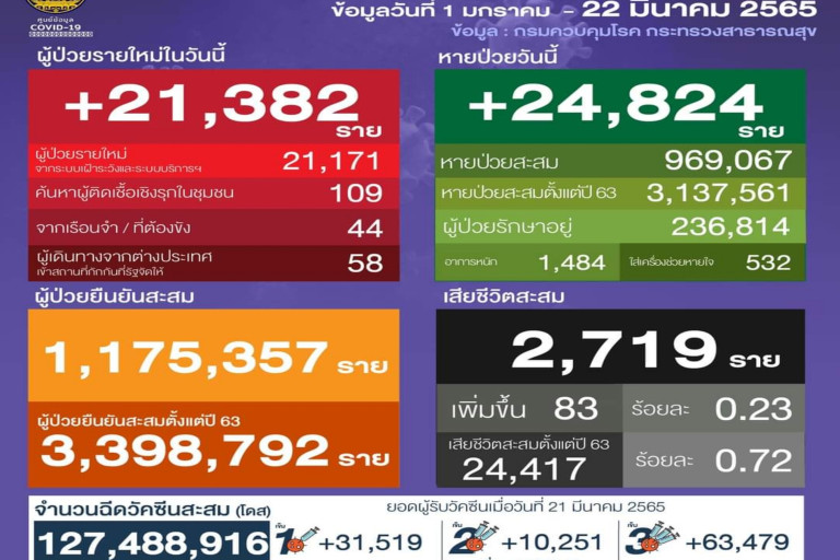 วันที่ 22 มี.ค.2565 ศูนย์ข้อมูลCOVID-19 รายงานสถานการณ์ผู้ป่วยติดเชื้อไวรัสโควิด-19 ว่า โดยล่าสุดพบผู้ติดเชื้อรายใหม่อีก 21,382 ราย โดยเป็นการติดเชื้อในประเทศ 21,324 ราย และเดินทางมาจากต่างประเทศอีก 58 ราย วันนี้มีรายงานลักลอบเข้าประเทศผิดกฎหมาย 12 ราย จากกัทพูชา 7 ราย มาเลเซีย 2 ราย และเมียนมา 3 ราย ติดเชื้อในประเทศ (แยกเป็นจากระบบเฝ้าระวังและบริการสุขภาพสูงถึง 21,171 ราย จากการตรวจคัดกรองเชิงรุกในชุมชน 109 ราย จากเรือนจำ/ที่ต้องขัง 44 ราย) รวมยอดผู้ป่วยสะสมตั้งแต่ปี 63 รวม 3,398,792 ราย อย่างไรก็ตามหากรวมยอดผู้ป่วยจากการตรวจ ATK จำนวน 13,220 ราย ตัวเลขผู้ป่วยรายใหม่จะมี 34,602 ราย