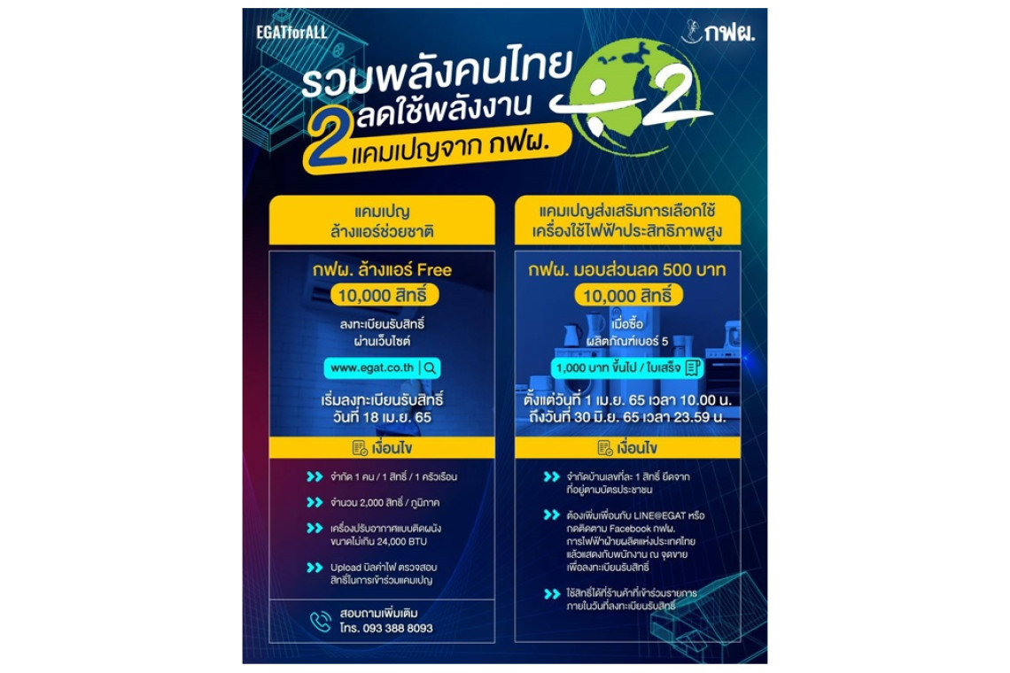 -ล้างแอร์ช่วยชาติ (Clean your air, Clean your life) กฟผ. ร่วมกับสมาคมผู้ค้าเครื่องปรับอากาศไทยให้บริการล้างแอร์แก่ประชาชนทั่วประเทศฟรีจำนวน 10,000 สิทธิ์ จำกัดครัวเรือนละ 1 สิทธิ์ต่อการล้างแอร์ฟรี 1 เครื่อง โดยต้องเป็นแอร์แบบติดผนังขนาดไม่เกิน 24,000 บีทียู เพียงลงทะเบียนรับสิทธิ์ผ่านทาง www.egat.co.th ตั้งแต่วันที่ 18 เมษายน 2565 เป็นต้นไป การล้างแอร์ทุก 6 เดือน สามารถลดการใช้พลังงานไฟฟ้าได้ถึง 10%