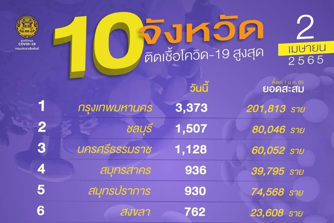 2 เม.ย.2565 ศูนย์ข้อมูลโควิด-19 รายงานสถานการณ์โรคติดเชื้อไวรัสโควิด-19 ข้อมูล ณ วันที่ 2 เม.ย.65 เวลา 01.00 น. ยังคงพบผู้ติดเชื้อรายใหม่ในทั้ง 77 จังหวัด โดย 10 อันดับจังหวัดติดเชื้อสูงสุด พบว่ากทม.ยังคงมีผู้ติดเชื้อรายใหม่อยู่ในอันดับ 1 อยู่ที่ 3,373 ราย เพิ่มขึ้นจากเมื่อวาน (จาก 3,350 ราย) เช่นเดียวกับ อันดับ 2 ชลบุรี 1,507 ราย (จาก 1,352 ราย) อันดับ 4 สมุทรสาคร 936 ราย (จาก 854 ราย) อันดับ 6 สงขลา 762 ราย (จาก 744 ราย) และอันดับ 10 ขอนแก่น 652 ราย(จาก 564 ราย)