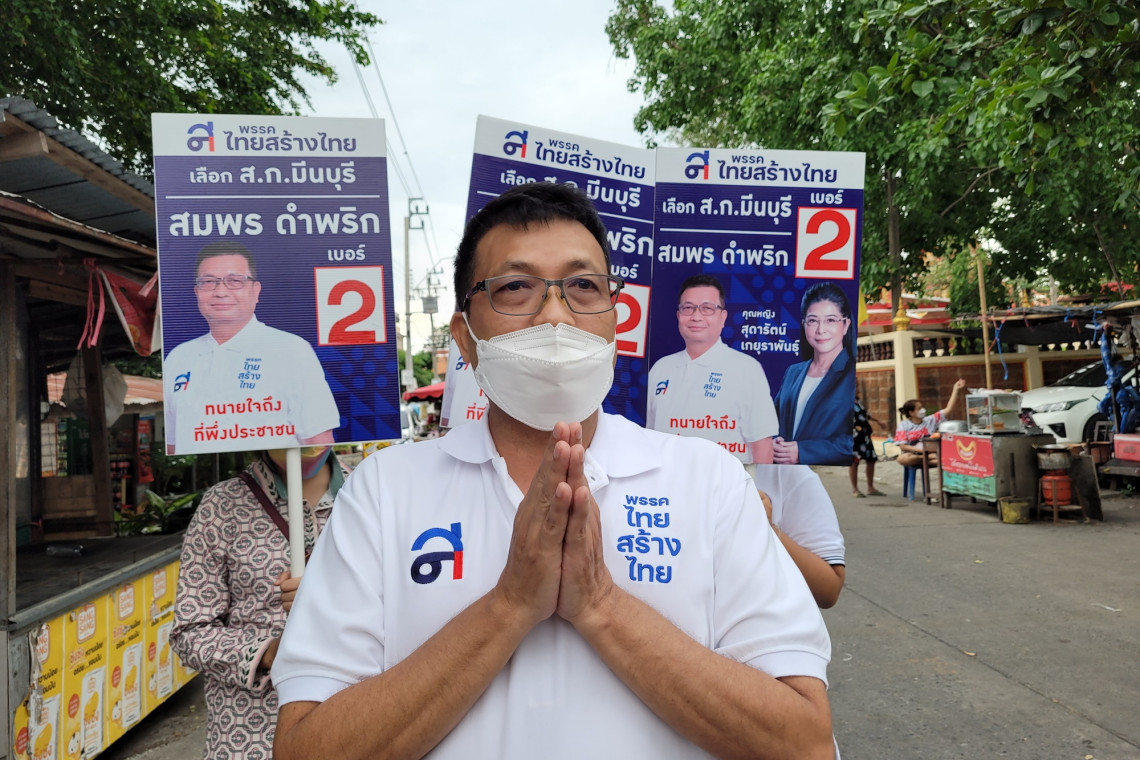 นายสมพร ดำพริก ผู้สมัครส.ก.เขตมีนบุรี พรรคไทยสร้างไทย หมายเลข 2 ลงพื้นที่ชุมชนวัดแสนสุข แนะนำตัวและชี้แจงนโยบายกับชาวบ้าน โดยเฉพาะนโยบายด้านเศรษฐกิจที่จะช่วยแก้ไขปัญหาปากท้องของประชาชน และการดูแลสร้างความเสมอภาค เป็นธรรม โดยระบุว่า แม้ไม่ได้เกิดที่มีนบุรี แต่ได้อยู่ที่มีนบุรีตั้งแต่ปี 2521 ได้ดูแลช่วยเหลือชาวบ้านมาตลอด โดยเฉพาะด้านคดีความ ทำให้ชาวบ้านได้รับความเป็นธรรมในฐานะทนายความ จนถูกชาวบ้านเรียกว่า ทนายชาวบ้าน ทนายของคนจน และหากได้รับเลือกเป็นส.ก.ก็จะทำให้การดูแลชาวบ้านเป็นระบบและทั่วถึงทั้งเขต ไม่เพียงเรื่องความเป็นธรรม แต่รวมถึงการผลักดันนโยบายประสานกับหน่วยงานที่เกี่ยวข้องให้ชาวบ้านอยู่ดีกินกินดี มีสาธารณูปโภคทั่วถึงเอื้อต่อการดำเนินชีวิตประจำวัน อีกทั้งที่ผ่านมา คุณหญิงสุดารัตน์ เกยุราพันธ์ หัวหน้าพรรคไทยสร้างไทย ก็ลงพื้นที่ทำงานให้คนมีนบุรีและคนกรุงเทพฯ มาโดยตลอก "จากการลงพื้นที่ได้รับการตอบรับจากชาวบ้านดีมาก เกือบทุกคนบอกว่าพร้อมสนับสนุนคนทำงาน คนติดดินไม่ทิ้งชาวบ้าน และจะบอกเพื่อนฝูงญาติพี่น้องให้สนับสนุนผมอย่างเต็มที่ หลายคนได้โทรศัพท์มาสนับสนุน จนรับสายแทบไม่ทัน ผมขอขอบคุณในไมตรีจิตของทุกท่านที่ให้การสนับสนุน และยืนยันว่า หากได้รับเลือกตั้งจะทำงานอย่างเต็มกำลังเพื่อให้คนมีบุรีได้ประโยชน์สูงสุด" นายสมพร กล่าวว่า ที่ผ่านมามีนบุรีได้พัฒนาอย่างเต็มที่ ทั้งที่มีศักยภาพมาก ทั้งคนที่มีความหลาย ทำเลที่ตั้ง และทรัพยากรที่มีพร้อม หากได้รับเลือกตั้งจะประสานกับทุกภาคส่วนดึงศักยภาพของมีนบุรี มาใช้ให้เกิดโยชน์อย่างเต็มที่ เพื่อให้ชาวบ้านอยู่ดีกินดี