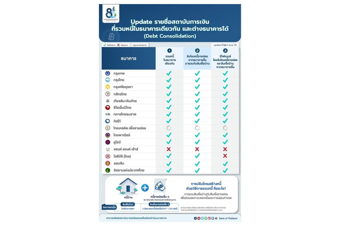 ธปท.ได้อัพเดตรายชื่อสถาบันการเงินที่มีมาตรการรวมหนี้ ทั้งในธนาคารและต่างธนาคาร สามารถรวมหนี้สินเชื่อบ้าน และสินเชื่อรายย่อย ประเภทอื่นเข้าด้วยกัน เพื่อช่วยลดภาระดอกเบี้ยและการผ่อนค่างวดในระยะยาว โดยลูกหนี้สามารถติดต่อสถาบันการเงิน โดยตรงเพื่อสมัครเข้าร่วมมาตรการได้ที่ https://bit.ly/3Iphakn