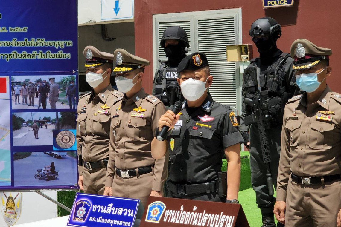 วันที่ 15 เมษายน 2565 เวลาประมาณ 13.00 น.ผู้สื่อข่าวรายงาน ว่า ที่กองบังคับการตำรวจภูธรจังหวัดสมุทรสาคร พล.ต.ท.ธนายุตม์ วุฒิจรัสธำรงค์ ผบช.ภ.7 พร้อมด้วย พล.ต.ต.อภิชาติ วรรณภักดิ์ ผบก.ภ.จว.สมุทรสาคร พ.ต.อ.พัฒน์ปกรณ์ ชั้นประเสริฐ รอง ผบก.ภ.จว.สมุทรสาคร พ.ต.อ.ธนากร วงศ์สิริลักษณ์ ผกก.สภ.เมืองสมุทรสาคร พ.ต.อ.ยอดชาย แก้วเรือง ผกก.สส.ภ.จว.สมุทรสาคร พ.ต.ท.ชุมพร ฉัตร์สงวนชัย รองผกก.ป.สภ.เมืองสมุทรสาคร และเจ้าหน้าที่ตำรวจชุดปฏิบัติการฯ ได้ร่วมกันแถลงผลการจับกุมตัวนายธีรเมศร์ แก้วหะ อายุ 55 ปี ผู้ต้องหาตามหมายจับของศาลจังหวัดสมุทรสาคร ที่ 88 / 2565 ลงวันที่ 8 เม.ย. 2565 ซึ่งต้องหาว่ากระทำความผิดฐาน “ฆ่าผู้อื่นโดยเจตนา, มีอาวุธปืนและเครื่องกระสุนปืนไว้ในความครอบครองโดยไม่ได้รับอนุญาต พาอาวุธปืนติดตัวไปในเมือง หมู่บ้าน หรือทางสาธารณะโดยไม่ได้รับอนุญาต, และพาอาวุธปืนติดตัวไปในเมืองหมู่บ้านโดยเปิดเผย หรือโดยไม่มีเหตุอันควร” พร้อม รถจักรยานยนต์ ยี่ห้อฮอนด้า รุ่นเวฟ 100 สีเทา หมายเลขทะเบียน กบค 270 สมุทรสาคร จำนวน 1 คัน ซึ่งเป็นยานพาหนะที่ใช้ในการหลบหนี