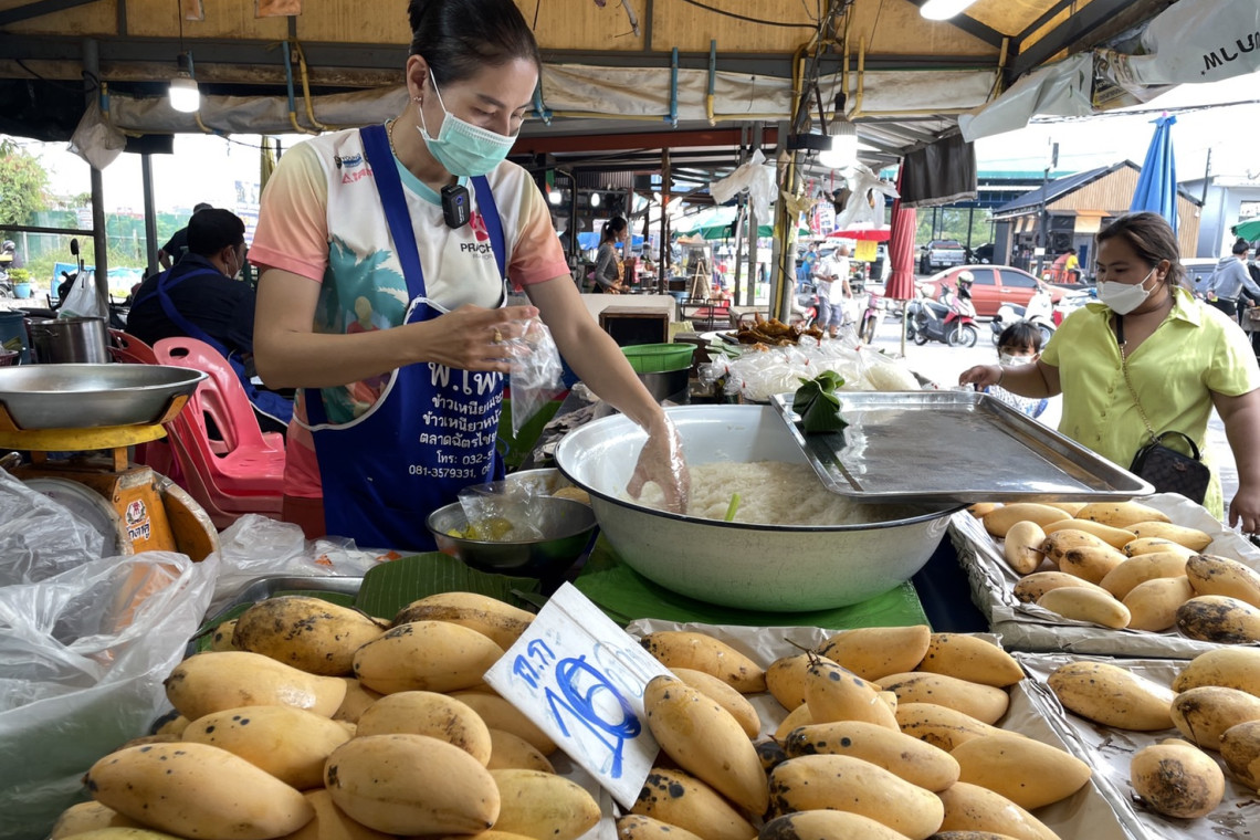 ทั้งนี้ในช่วงเดือนมีนาคม-เมษายน เป็นฤดูขายข้าวเหนียวมะม่วง เนื่องจากเป็นช่วงที่มะม่วงออกสู่ตลาดจำนวนมาก ทำให้มีราคาถูก ซึ่งที่ร้านใช้มะม่วงน้ำดอกไม้สีทองจากสวนเกษตรกรที่ อ.สามร้อยยอด จ.ประจวบคีรีขันธ์ เพื่อช่วยสนับสนุนเกษตรกรในชุมชน อีกทั้งสามร้อยยอดยังเป็นแหล่งปลูกมะม่วงน้ำดอกไม้แหล่งใหญ่ของจังหวัด ผลิตมะม่วงน้ำดอกไม้คุณภาพดี รสชาติหวาน