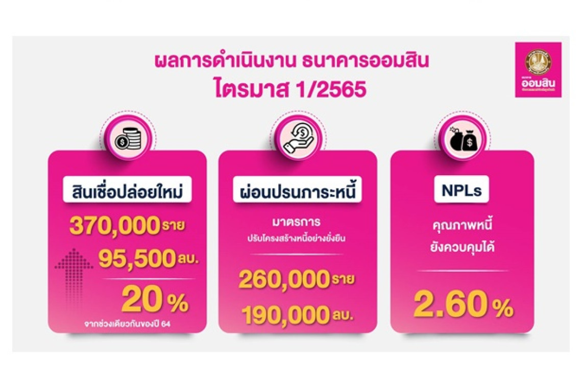 นายวิทัย รัตนากร ผู้อำนวยการธนาคารออมสิน เปิดเผยว่า ในช่วง 3 เดือนแรก ปี 2565 ธนาคารออมสินได้ให้ความสำคัญในการช่วยเหลือประชาชนผู้ที่ตกงานหรือขาดรายได้ ผู้ประกอบการรายย่อย ที่ได้รับผลกระทบจากการแพร่ระบาดของโควิด-19 โดยธนาคารปล่อยสินเชื่อใหม่รวม 95,500 ล้านบาท ทั้งสินเชื่อรายย่อย สินเชื่อธุรกิจ และสินเชื่อภาครัฐ เพิ่มขึ้นร้อยละ 20 เมื่อเทียบกับช่วงเดียวกันของปี 2564 รวมกว่า 370,000 ราย ในจำนวนนี้เป็นสินเชื่อตามนโยบายของรัฐบาล โดยพล.อ.ประยุทธ์ จันทร์โอชา นายกรัฐมนตรีและ รมว.กลาโหม อาทิ สินเชื่อสร้างงานสร้างอาชีพ จำนวน 33,000 ราย ปล่อยสินเชื่อรวม 1,600 ล้านบาท พร้อมกับอบรมทักษะอาชีพภายใต้โครงการออมสิน สร้างงาน สร้างอาชีพ ได้มากกว่า 16,200 ราย และสินเชื่อห่วงใย (เพื่อสู้ภัยโควิด-19) เพื่อช่วยเหลือกลุ่มประชาชนรายย่อยที่มีปัญหาขาดสภาพคล่อง ได้มีเงินหมุนเวียนใช้สอยในครอบครัวอีกกว่า 50,000 ราย ซึ่งรวมถึงการปล่อยสินเชื่อจำนำทะเบียนรถผ่านพันธมิตรของธนาคารด้วย เป็นต้น สำหรับด้านการบริหารจัดการหนี้ ได้ช่วยเหลือลูกหนี้ที่ได้รับผลกระทบจากโควิด-19 ให้ได้รับการผ่อนปรนอย่างต่อเนื่อง ด้วยมาตรการปรับโครงสร้างหนี้อย่างยั่งยืน ซึ่งในไตรมาสแรก ปี 2565 ธนาคารปรับโครงสร้างหนี้ได้ 260,000 ราย คิดเป็นยอดหนี้ 190,000 ล้านบาท ขณะที่จำนวนผู้ขอปรับโครงสร้างหนี้ลดลงจากเดิม เมื่อเทียบกับช่วงสถานการณ์โควิดปี 2563 ที่มียอดถึง 800,000 ราย ซึ่งถือว่าสถานการณ์เริ่มดีขึ้น ทั้งจากมาตรการสนับสนุนต่างๆของรัฐบาล และสถานการณ์โควิด-19 ทำให้ลูกหนี้มีศักยภาพกลับมาชำระหนี้ได้ตามปกติ โดยคาดว่าปีนี้จะสามารถช่วยเหลือลูกหนี้ได้มากกว่า 447,000 ราย ในส่วนของหนี้ที่ไม่ก่อให้เกิดรายได้ หรือ NPLs อัตราเพิ่มสูงขึ้นเล็กน้อยจาก 2.5% เป็น 2.6% ซึ่งเป็นไปตามที่คาดการณ์ไว้ โดยแนวโน้มหรือทิศทางของหนี้เสีย ยังอยู่ในสถานการณ์ที่สามารถบริหารจัดการได้ โดย ณ วันที่ 31 มีนาคม 2565 ธนาคารมียอดสินทรัพย์รวม 2,962,012 ล้านบาท ยอดเงินฝากรวม 2,513,919 ล้านบาท เงินให้สินเชื่อรวม 2,185,558 ล้านบาท มีระดับความแข็งแกร่งพิจารณาจากอัตราส่วนเงินกองทุนต่อสินทรัพย์เสี่ยง (BIS Ratio) อยู่ที่ร้อยละ 16.22 ทั้งนี้ ผลการดำเนินงานในภาพรวมของไตรมาสแรก ปี 2565 ดีขึ้นเมื่อเทียบกับช่วงเดียวกันของปี 2564