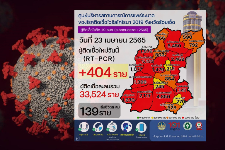 นายแพทย์ปิติ ทั้งไพศาล นพ.สสจ.ร้อยเอ็ด มอบหมายให้ จนท.รายงานสถานการณ์ไวรัสโคโรนา 2019 COVID-19 จังหวัดร้อยเอ็ด ประจำวันที่ 23 เมษายน 2565 ดังนี้ ผู้ติดเชื้อรายใหม่ วันนี้ (ระลอก มกราคม 2565)ใน19อำเภอจาก20อำเภอ 404 ราย ผู้ป่วยสะสม 33,524 รายรักษาหาย 470 ราย คงพยาบาล 3,802 ราย เสียชีวิต 3 ราย เสียชีวิตสะสม 139 ราย ยอดผู้ป่วยโควิด 19 ยืนยันสะสม ในจังหวัดร้อยเอ็ด ยอดสะสม :47,298 ราย เรือนจำ 0 ราย เสียชีวิตสะสม : 257 ราย