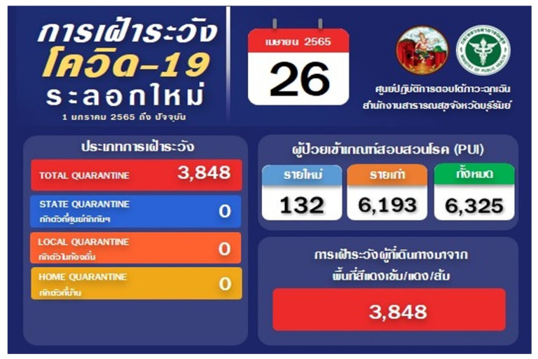ส่วนผู้ป่วยเข้าเกณฑ์สอบสวนโรค (PUI) ทั้งหมด 6,325 ราย เป็นรายใหม่ 132 ราย และรายเก่า 6,193 ราย การเฝ้าระวังผู้ที่เดินทางมาจากพื้นที่สีแดงเข้ม/แดง/ส้ม 3,848 ราย