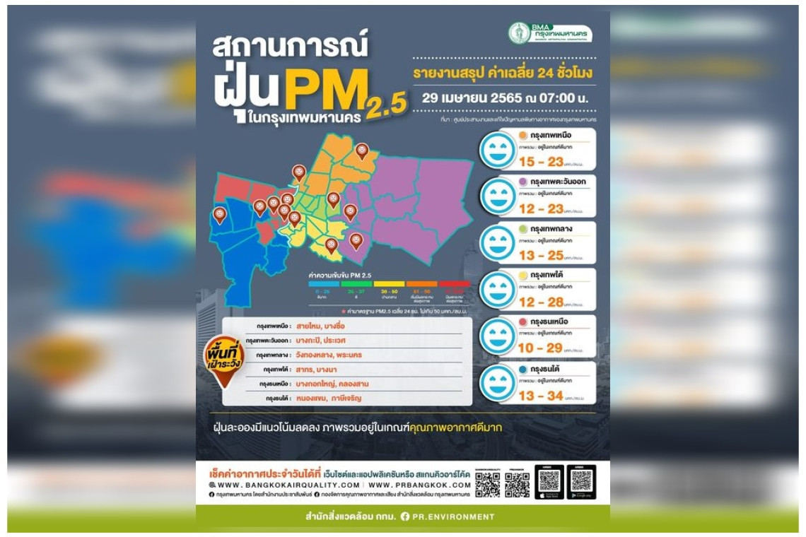 ประจำวันศุกร์ที่ 29 เมษายน พ.ศ. 2565 เวลา 07.00 น. ค่าเฉลี่ย 24 ชั่วโมง ของฝุ่นละอองขนาดไม่เกิน 2.5 ไมครอน (PM2.5)