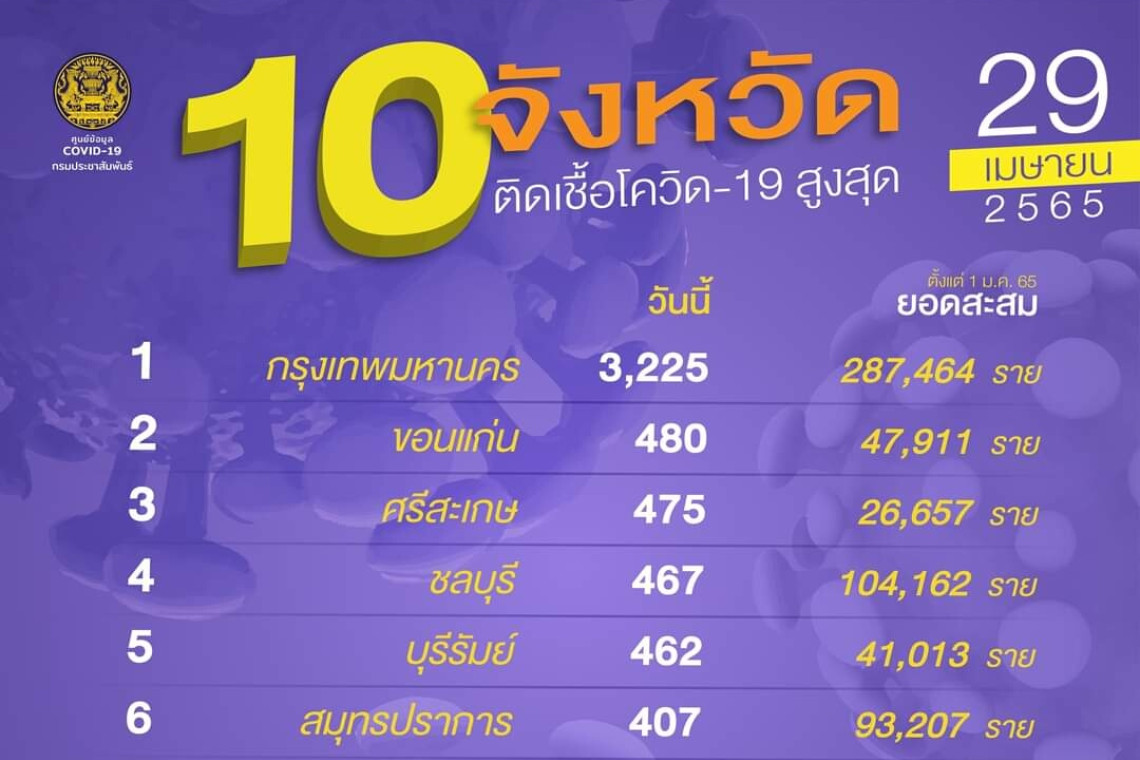 29 เม.ย.2565 ศูนย์ข้อมูลโควิด-19 รายงานสถานการณ์โรคติดเชื้อไวรัสโควิด-19 ข้อมูล ณ วันที่ 29 เม.ย.65 เวลา 01.00 น. พบผู้ติดเชื้อรายใหม่ยกประเทศ 77 จังหวัด โดย 10 อันดับจังหวัดติดเชื้อสูงสุด พบว่ากทม.ยังคงมีผู้ติดเชื้อรายใหม่อยู่ในอันดับ 1 อยู่ที่ 3,225 ราย เพิ่มขึ้นจากเมื่อวาน (จาก 3,056 ราย) อันดับ 2 ขอนแก่น 480 ราย (จาก 499 ราย) อันดับ 3 ศรีษะเกษ 475 ราย (จาก 421 ราย) อันดับ 4 ชลบุรี 467 ราย (จาก 499 ราย) อันดับ 5 บุรีรัมย์ 462 ราย (จาก 409 ราย) อันดับ 6 สมุทรปราการ 407 ราย (จาก ) อันดับ 7 อุบลราชธานี 365 ราย (จาก 299 ราย) อันดับ 8 นครราชสีมา 343 ราย (จาก 231 ราย) อันดับ 9 นครปฐม 327 ราย (จาก 297 ราย) อันดับ 10 ฉะเชิงเทรา 325 ราย (จาก 248 ราย)