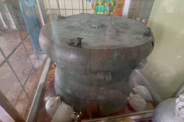 โดยมีพระครูพิพัฒน์พิบูลย์ เป็นเจ้าอาวาสวัดศิริธรรมพัฒนา ที่เก็บรักษาไว้ใต้ฐานพระพุทธศิริอรัญญมหามุณีปฏิมากร ( หลวงพ่อสบาย) ของวัดหลังจากที่ชาวบ้านได้ขึ้นไปเก็บของป่าบนภูเขาสูงชันซึ่งเป็นภูเขาที่อยู่ติดบริเวณของวัด แล้วพบวัตถุแปลกประหลาดโผลขึ้นมาจากดินประมาณ 1 คืบ แล้วทำการขุดลงไปเรื่อยๆจนพบว่าเป็นกลองโบราณ จึงได้เรียกชาวบ้านให้มาช่วยกันนำลงมาเก็บรักษาไว้ที่วัด ซึ่งก็มีชาวบ้านละแวกใกล้เคียงที่รู้ข่าวต่างเดินทางมาสักการะกราบไหว้