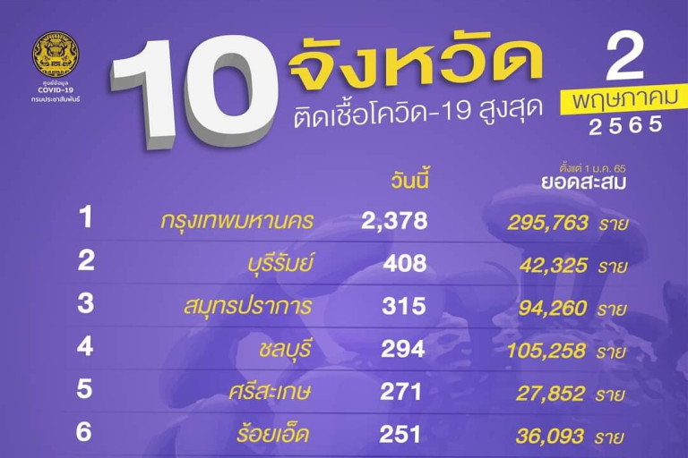 2 พ.ค.2565 ศูนย์ข้อมูลโควิด-19 รายงานสถานการณ์โรคติดเชื้อไวรัสโควิด-19 ข้อมูล ณ วันที่ 2 พ.ค.65 เวลา 01.00 น. พบผู้ติดเชื้อรายใหม่ 76 จังหวัด มีเพียงจังหวัดลำพูนเท่านั้นที่วันนี้ไม่พบผู้ติดเชื้อรายใหม่ โดย 10 อันดับจังหวัดติดเชื้อสูงสุด พบว่ากทม.ยังคงมีผู้ติดเชื้อรายใหม่อยู่ในอันดับ 1 อยู่ที่ 2,378 ราย ลดลงจากเมื่อวาน (จาก 2,870 ราย) อันดับ 2 บุรีรัมย์ 408 ราย (จาก 437 ราย) อันดับ 3 สมุทรปราการ 315 ราย (จาก 352 ราย) อันดับ 4 ชลบุรี 294 ราย (จาก 370 ราย) อันดับ 5 ศรีษะเกษ 271 ราย (จาก 428 ราย) อันดับ 6 ร้อยเอ็ด 251 ราย (จาก 302 ราย) อันดับ 7 สุรินทร์ 250 ราย (จาก 228 ราย) อันดับ 8 นนทบุรี 234 ราย (จาก 324 ราย) อันดับ 9 อุบลราชธานี 221 ราย (จาก 298 ราย) อันดับ 10 ขอนแก่น 205 ราย (จาก 266 ราย)