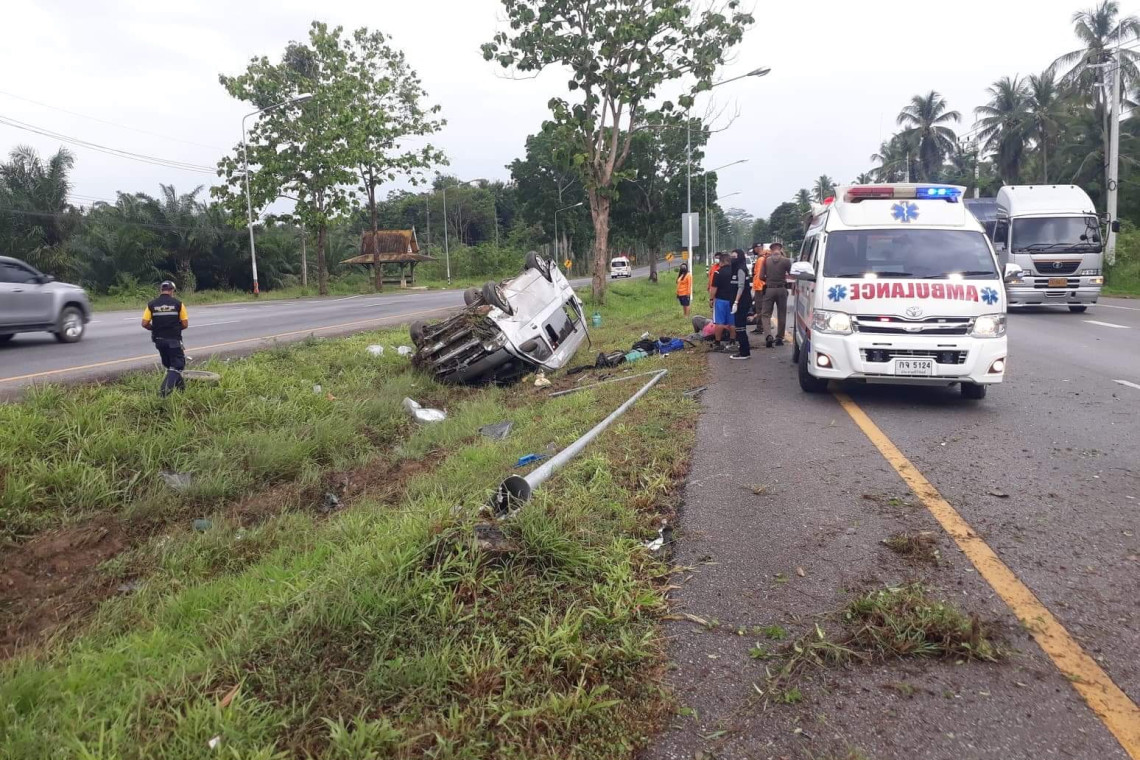 เบื้องต้นทราบว่ารถตู้คันดังกล่าวมีนายมานะ อินอ๊อด อายุ 45 ปี อยู่บ้านเลขที่ 189/311 ม.1 ต.บางรักพัฒนา อ.บางบัวทอง จ.นนทบุรี เป็นคนขับ ซึ่งออกเดินทางมาจาก จ.นนทบุรี กำลังจะเดินทางไปยัง จ.สุราษฎร์ธานี เมื่อมาถึงที่เกิดเหตุซึ่งเป็นทางโค้งและฝนได้ตกลงมาส่งผลให้ถนนลื่น ทำให้รถตู้คันกล่าวได้เกิดเสียหลักพลิกคว่ำลงร่องกลาง ส่งผลให้ผู้โดยสารที่เดินทางมาด้วย บาดเจ็บ 5 ราย สำหรับรายชื่อผู้บาดเจ็บทั้ง 5 รายประกอบด้วย1. นายรณชัย เข็มกลัด อายุ 47 ปี อยู่บ้านเลขที่ 19/9 ม.9 ต.บางกร่าง อ.เมือง นนทบุรี