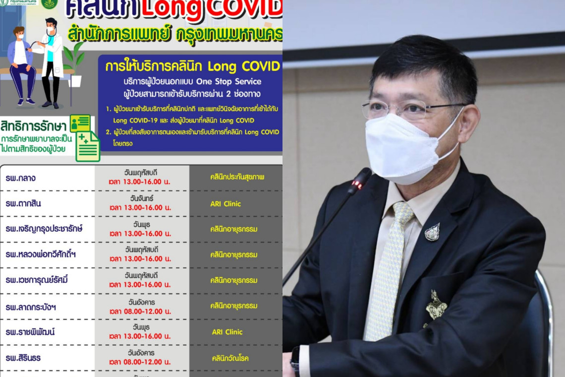 (5 พ.ค. 65) นายขจิต ชัชวานิชย์ ปลัดกรุงเทพมหานคร เปิดเผยว่า กรุงเทพมหานคร โดยสำนักการแพทย์ ได้เตรียมเปิดคลินิกรักษาผู้ป่วย Long COVID โดยดำเนินการตามแนวทางของกรมการแพทย์ กระทรวงสาธารณสุข เพื่อดูแลผู้ป่วยโควิด-19 ที่พ้นระยะเฉียบพลันและยังคงมีอาการผิดปกติในระบบต่าง ๆ ของร่างกาย ครอบคลุมการให้คำปรึกษา การตรวจประเมิน การส่งตรวจทางห้องปฏิบัติการหรือตรวจพิเศษ การวินิจฉัย การดูแลรักษา ติดตามอาการ และการส่งต่อแพทย์ผู้เชี่ยวชาญเฉพาะทาง (กรณีจำเป็น) ในรูปแบบการให้บริการแบบผู้ป่วยนอก (Onsite และ Online Telemedicine) โดยเปิดคลินิก 1 วัน/สัปดาห์ เริ่มเปิดให้บริการในวันที่ 9 พ.ค. 65 เป็นต้นไป ในวันและเวลาราชการ สำหรับคุณสมบัติผู้ป่วยที่เข้ารับการรักษาในคลินิก Long COVID จะต้องเป็นผู้ป่วยโควิด-19 ที่หายป่วยมากกว่า 1 เดือนขึ้นไป การให้บริการจะเน้นไปทางติดตามอาการที่เกิดหลังจากหายป่วยโควิด-19 โดยผู้ป่วยสามารถรับบริการผ่าน 2 ช่องทาง ดังนี้ 1. ผู้ป่วยมาเข้ารับบริการที่คลินิกปกติ และแพทย์วินิจฉัยอาการที่เข้าได้กับ Long COVID และส่งผู้ป่วยมาที่คลินิกดังกล่าว และ 2. ผู้ป่วยที่สงสัยอาการตนเองและเข้ามารับบริการที่คลินิก Long COVID โดยตรง รูปแบบการให้บริการแบบ One stop service จัดให้มีการบริการคัดกรอง พบแพทย์ในจุดเดียว กรณีที่ต้องมีการปรึกษาจิตแพทย์ จะให้มีการทำแบบสอบถามเพื่อประเมินความเสี่ยงทางด้านสุขภาพจิตก่อนเข้าพบแพทย์ ทั้งนี้ การรักษาพยาบาลเป็นไปตามสิทธิของผู้ป่วย สำหรับบุคลากรทางการแพทย์ที่ปฏิบัติงานในคลินิก Long COVID จะแบ่งเป็น 1. บุคลากรที่ปฏิบัติงานในคลินิก Long COVID ประกอบด้วย แพทย์เวชปฏิบัติทั่วไป พยาบาลวิชาชีพ สหวิชาชีพอื่น ๆ เช่น นักกายภาพบำบัด เป็นต้น 2. กรณีที่จำเป็นต้องได้รับการปรึกษาจากผู้เชี่ยวชาญสาขาต่าง ๆ ประกอบด้วย อายุรแพทย์ระบบทางเดินหายใจ อายุรแพทย์ระบบประสาท จิตแพทย์ เป็นต้น ทั้งนี้ ผู้ป่วยโควิด-19 ที่หายป่วยมากกว่า 1 เดือนขึ้นไป สามารถรับบริการได้ที่โรงพยาบาลสังกัดสำนักการแพทย์ กรุงเทพมหานคร ทั้ง 9 แห่ง รายละเอียดดังนี้ 1. โรงพยาบาลกลาง ณ คลินิกประกันสุขภาพ ทุกวันพฤหัสบดี เวลา 13.00-16.00 น. 2. โรงพยาบาลตากสิน ณ ARI Clinic ทุกวันจันทร์ เวลา 13.00-16.00 น. 3. โรงพยาบาลเจริญกรุงประชารักษ์ ณ คลินิกอายุรกรรม ทุกวันพุธ เวลา 13.00-16.00 น. 4. โรงพยาบาลหลวงพ่อทวีศักดิ์ ชุตินธฺโร อุทิศ ณ คลินิกอายุรกรรม ทุกวันพฤหัสบดี เวลา 13.00-16.00 น. 5. โรงพยาบาลเวชการุณย์รัศมิ์ ณ คลินิกอายุรกรรม ทุกวันพฤหัสบดี เวลา 13.00-16.00 น. 6. โรงพยาบาลลาดกระบังกรุงเทพมหานคร ณ คลินิกอายุรกรรม ทุกวันอังคาร เวลา 08.00-12.00 น. 7. โรงพยาบาลราชพิพัฒน์ 