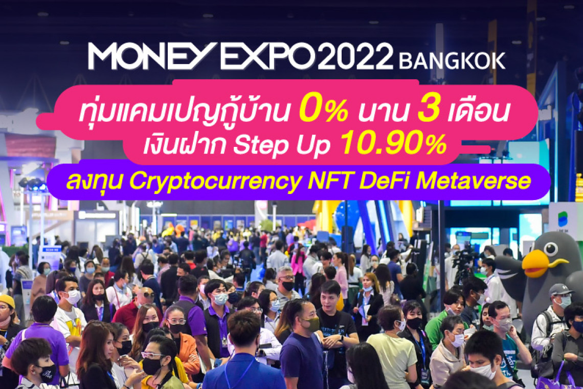 งานมหกรรมการเงินกรุงเทพ ครั้งที่ 22 Money Expo 2022 Bangkok แบงก์/นอนแบงก์/ประกัน/บล./บลจ. ขนทัพโปรโมชั่นแรงกระตุ้นเศรษฐกิจฟื้นตัวหลังโควิด-19 สินเชื่อบ้านดอกเบี้ย 0% นาน 3 เดือน เงินฝาก Step Up ดอกเบี้ยสูงสุด 10.90% สินเชื่อเอสเอ็มอี ดอกเบี้ย 2%/ปี กู้ได้สูงสุด 10 ล้านบาท ทรัพย์ NPA ทำเลเด่น ลดสูงสุด 60% ชำระเบี้ยประกัน รับฟรี! ทองคำแท่งหนัก 10 บาท ลงทุน หุ้น กองทุน พร้อมเปิดโลกการลงทุนยุคใหม่ Digital Asset NFT DeFi Metaverse Cryptocurrency ฟังสัมมนาสัมมนา/เวิร์กช็อปคับคั่ง วันที่ 12-15 พฤษภาคม 2565 ชาเลนเจอร์ 2-3 อิมแพ็ค เมืองทองธานี