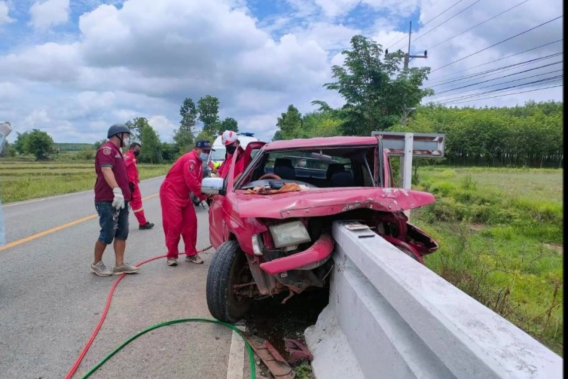 สลด! พระซิ่งปิคอัพเสียบกลางราวสะพาน ถูกอัดก็อปปี้คาที่นั่งคนขับ หน่วยกู้ภัยต้องใช้เครื่องตัดถ่างงัดออกมาได้ สาเหตุเป็นไปได้ทั้งขับมาเร็ว ไม่ชินทาง เล่นโทรศัพท์ หรือหลับใน