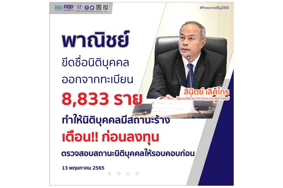 “พาณิชย์”ขีดชื่อนิติบุคคลจำนวน 8,833 รายออกจากระบบ ทำให้มีสถานะร้าง หลังไม่ส่งงบการเงินติดต่อกัน 3 ปี และไม่จดทะเบียนชำระบัญชีใน 3 ปี นับจากวันจดทะเบียนเลิก เพื่อปรับฐานข้อมูลนิติบุคคลให้เป็นปัจจุบัน และป้องกันมิจฉาชีพนำความน่าเชื่อถือของนิติบุคคลไปหลอกลวงประชาชน แนะการติดต่อทำธุรกิจหรือร่วมลงทุน ต้องตรวจสอบนิติบุคคลให้ดีก่อน ทำได้ผ่าน 3 ช่องทาง