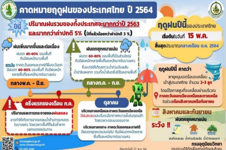 วันที่ 13 พ.ค.65 นายประพิศ จันทร์มา อธิบดีกรมชลประทาน เปิดเผยว่าตามที่กรมอุตุนิยมวิทยาประกาศประเทศไทยเข้าสู่ฤดูฝนอย่างเป็นทางการในวันที่ 13 พฤษภาคม 2565 ปริมาณฝนรวมในปีนี้สูงกว่าค่าเฉลี่ย 3 % ส่วนในช่วงกลางเดือนมิถุนายนถึงกลางเดือนกรกฎาคม 2565 ปริมาณฝนจะลดลงอาจทำให้เกิดฝนตกน้อย หลังจากนั้นฝนจะตกชุกหนาแน่นในช่วงเดือนสิงหาคมถึงกันยายน 2565 โดยฤดูฝนปีนี้คาดว่าจะมีพายุหมุนเขตร้อนเคลื่อนเข้าสู่ประเทศไทย จำนวน 2 ลูก มีโอกาสสูงที่จะเคลื่อนผ่านบริเวณภาคตะวันออกเฉียงเหนือและภาคเหนือ
