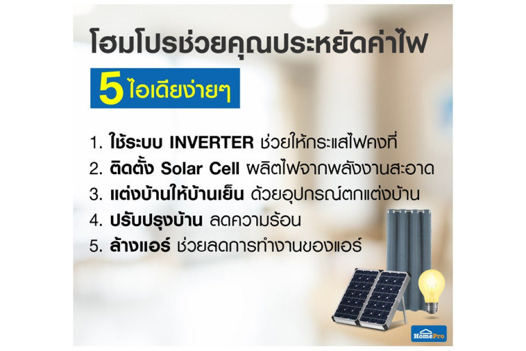 โฮมโปรชวนคนรักบ้านส่องไอเดียง่าย ๆ 5 วิธี ช่วยประหยัดค่าไฟ แถมได้เริ่มลงมือปรับปรุงแต่งบ้านไปในตัว เรียกได้ว่านอกจากจะเซฟเงินค่าไฟได้ไม่น้อยแล้ว เรายังได้บ้านเย็น ๆ พร้อมสู้ไอแดดของเมืองไทยไปทั้งปีอีกด้วย !! ไอเดีย 1 ใช้ระบบ INVERTER ช่วยให้กระแสไฟคงที่ ช่วยรักษากำลังไฟอย่างสม่ำเสมอและต่อเนื่อง ไม่ว่าเราจะเปิด-ปิดตู้เย็นบ่อย ๆ หรือปรับอุณหภูมิแอร์ไปมา ระบบ INVERTER ก็จะช่วยให้เครื่องใช้ไฟฟ้าไม่ต้องดึงกำลังไฟซ้ำ ๆ ทำให้ประหยัดพลังงานได้กว่า 40% เลยทีเดียว ไอเดีย 2 ติดตั้ง Solar Cell ผลิตไฟจากพลังงานสะอาด พลังงานแสงอาทิตย์จากโซลาร์เซลล์ยังเป็นพลังงานสะอาด ไม่สร้างมลพิษ แถมมีอายุการใช้งานเกินกว่า 10 ปี ยิ่งถ้าติดตั้งในยุคนี้ ที่โซลาร์เซลล์ลดราคาลงมาแบบจับต้องได้ ก็มั่นใจได้เลยว่าคุ้มค่าในระยะยาวแน่นอน ที่สำคัญคือตอนนี้โฮมโปรมีโปรโมชั่น ผ่อนชำระ 0% นานสูงสุดถึง 10 เดือน เพียงใช้บัตรเครดิตที่ร่วมรายการเท่านั้น ไอเดีย 3 แต่งบ้านให้เย็น ด้วยอุปกรณ์ตกแต่งบ้าน วิธีง่าย ๆ ที่ช่วยทั้งลดค่าไฟฟ้าบวกได้บ้านสวย ๆ มาเชยชม เพียงแค่เราเลือกอุปกรณ์แต่งบ้านให้ถูกจุด ซึ่งก็มีให้เราได้เลือกอย่างหลากหลายแล้วแต่ความชอบและสไตล์แต่งบ้านของเราเอง เช่น เลือกใช้ผ้าม่านทึบแสง ช่วยลดไอแดดและความร้อนเข้ามาในห้อง ทำให้เราลดการใช้ไฟฟ้าไปในตัว, ใช้หลอดไฟ LED แทนหลอดไส้ ที่ใช้ไฟน้อยแถมมีอายุการใช้งานยาวนานกว่าด้วย, ตกแต่งบ้านด้วยเฟอร์นิเจอร์โทนเย็นหรือต้นไม้ ช่วยลดความรู้สึกไม่ให้บ้านร้อนจนเกินไป จนเราต้องเร่งแอร์โดยไม่รู้ตัว ไอเดีย 4 ปรับปรุงบ้าน ลดความร้อน ถัดจากการตกแต่งลองมาใช้การปรับปรุงบ้านกันดูบ้าง วิธีนี้นอกจากจะประหยัดค่าไฟลงได้ดีมาก ๆ แล้ว เรายังได้ดูแลรักษาบ้านไปในตัว และช่วยให้บ้านดูใหม่ขึ้นอีกด้วย ตัวอย่างเช่นการนำวัสดุอย่าง ฉนวนใยแก้วนำความร้อนสำหรับติดตั้งบนฝ้าเพดาน เพื่อช่วยสะท้อนความร้อนจากแสงแดดที่ส่องลงมาบนตัวบ้าน หรือใครจะเลือกใช้วิธีทาสีบ้านก็น่าสนใจไม่แพ้กัน กับสีที่มีคุณสมบัติสะท้อนความร้อนและช่วยป้องกันรังสี UV จึงตอบโจทย์ได้บ้านที่เย็นสบาย จึงทำให้เราได้ลดการใช้พลังงานลง พร้อมลดตัวเลขในบิลค่าไฟได้แบบสบาย ๆ ไอเดีย 5 ล้างแอร์ ช่วยลดการทำงานของแอร์จะทำให้แอร์ทำงานได้อย่างมีประสิทธิภาพขึ้น สามารถให้ความเย็นได้อย่างสม่ำเสมอ จึงช่วยลดอัตราการใช้ไฟฟ้าน้อยลงตามไปด้วย ยิ่งถ้าล้างแอร์โดยช่างผู้เชี่ยวชาญ เราสามารถเลือกให้ช่างอบโอโซนหรือฉีดน้ำยาฆ่าเชื้อโรค เพื่อสุขอนามัยที่ดีเพิ่มเติม