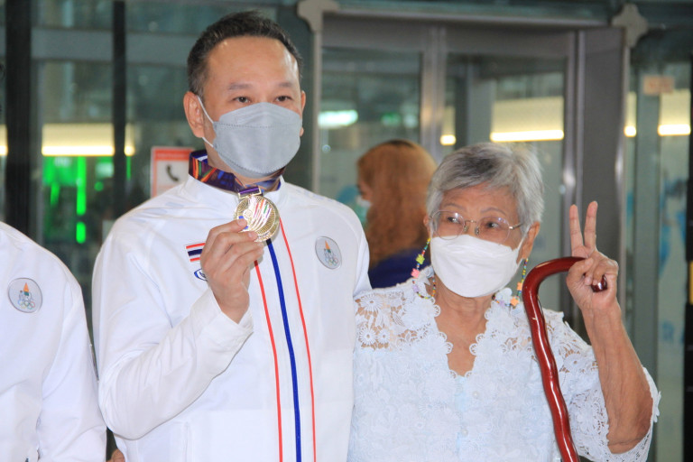 เมื่อเวลา 13.00 น.วันที่ 23 พ.ค.2565 ที่ชั้น 2 อาคารผู้โดยสารขาเข้า ท่าอากาศยานสุวรรณภูมิ นายสุนทร จารุมนต์ นายกสมาคมกีฬาบิลเลียดแห่งประเทศไทย พร้อมด้วยคณะและนาง พลอยรุ้ง ภู่โอบอ้อม มารดา พร้อมญาติ เดินทางเดินมาให้การต้อนรับ นายไชยพงศ์ กรวสุรมย์ ผู้จัดการทีมสนุกเกอร์ชุดซีเกมส์ และ นายวัฒนา ภู่โอบอ้อม หรือ ต๋อง ศิษย์ฉ่อย พร้อมคณะทีมสนุกเกอร์ชุดซีเกมส์ ทีมชาติไทย ที่เดินทางกลับมาถึงประเทศไทย ด้วยสายการบิน ไทยสมาย แอร์ไลน์ เที่ยวบิน WE561 หลังจากที่ทีมชาติไทย สามารถทำผลงาน กีฬาซีเกมส์ ครั้งที่ 31 ประเทศเวียดนาม มี สนุกเกอร์ 15 แดง 1 เหรียญทอง นาย วัฒนา ภู่โอบอ้อม (ต๋อง ศิษย์ฉ่อย) 1 เหรียญทองแดง นายภาสกร สุวรรณวัฒน์ (กร นครปฐม) สนุกเกอร์ 6 แดง 1 เหรียญทองแดง นายสุชาครีย์ พุ่มแจ้ง (ขวัญ สระบุรี) บิลเลียดเดี่ยว 2 เหรียญทองแดง นายประพฤติ ชัยธนสกุล รมย์ สุรินทร์ นายยุทธภพ ภาคพจน์ (นุ้ก จันท์) บิลเลียดคู่ 1 เหรียญทองแดง นายประพฤติ ชัยธนสกุล (รมย์ สุรินทร์) กับ นายธวัช สุจริตธุรการ (วัช หาดใหญ่) พูล 10 ลูกหญิงเดี่ยว 1 เหรียญทองแดง น.ส. เพ็ญนิภา นาคจุ้ย (น้ำ พัทยา) แครอมบอล 3 ชิ่ง 2 เหรียญทองแด นายสุริยา สุวรรณสิงห์ (หรั่ง พัทยา) นาย สมพล แซ่ตั้ง (เต่า มาสเตอร์)