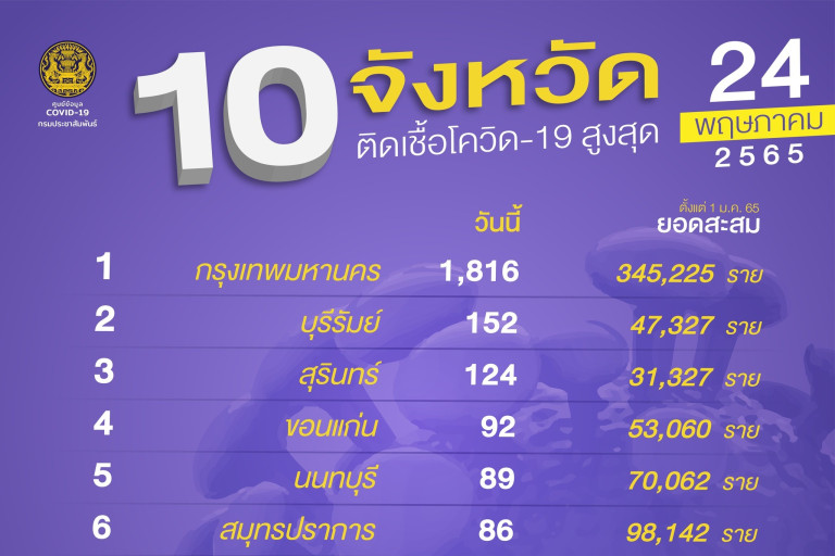 24 พ.ค.2565 ศูนย์ข้อมูลโควิด-19 รายงานสถานการณ์โรคติดเชื้อไวรัสโควิด-19 ข้อมูล ณ วันที่ 24 พ.ค.65 เวลา 01.00 น. พบผู้ติดเชื้อรายใหม่ 75 จังหวัด มีเพียงจังหวัดลำพูน ลำปาง เท่านั้นที่วันนี้ไม่พบผู้ติดเชื้อรายใหม่ โดย 10 อันดับจังหวัดติดเชื้อสูงสุด พบว่ากทม.ยังคงมีผู้ติดเชื้อรายใหม่อยู่ในอันดับ 1 อยู่ที่ 1,816 ราย เพิ่มขึ้นจากเมื่อวาน (จาก 1,425 ราย) อันดับ 2 บุรีรัมย์ 152 ราย (จาก 149 ราย) อันดับ 3 สุรินทร์ 124 ราย (จาก 161 ราย) อันดับ 4 ขอนแก่น 92 ราย (จาก 86 ราย) อันดับ 5 นนทบุรี 89 ราย (จาก 94 ราย) อันดับ 6 สมุทรปราการ 86 ราย (จาก 94 ราย) อันดับ 7 ร้อยเอ็ด 85 ราย (จาก 87 ราย) อันดับ 8 ชลบุรี 82 ราย (จาก 84 ราย) อันดับ 9 อุบลราชธานี 80 ราย (จาก 182 ราย อันดับ 10 นครพนม 72 ราย (จาก 78 ราย) ทั้งนี้ พบมี 3 จังหวัดที่พบผู้ติดเชื้อรายใหม่เกินร้อย โดยสูงที่สุดที่) ภาคตะวันออกเฉียงเหนือ 2 จังหวัด (จาก 20 จังหวัด) ตามด้วยภาคกลาง 1 จังหวัด (จาก 22 จังหวัด ส่วนภาคตะวันตก ภาคตะวันออก ภาคใต้ไม่มีติดเชื้อใหม่เกินร้อย โดยจังหวัดนราธิวาส ไม่มีรายงานผู้ติดเชื้อรายใหม่ เช่นเดียวกับภาคเหนือวันนี้ติดเชื้อใหม่ไม่เกินร้อยทั้ง 9 จังหวัด และมีเพียงจังหวัดลำปาง ที่ไม่มีรายงานผู้ติดเชื้อรายใหม่