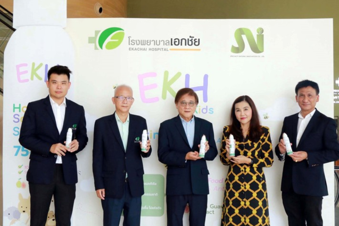 นพ.อำนาจ เอื้ออารีมิตร กรรมการและผู้อำนวยการโรงพยาบาล พร้อมผู้บริหารบริษัท เอกชัยการแพทย์ จำกัด (มหาชน) (EKH) ถ่ายภาพร่วมกับ รศ.ดร.พรรณวิภา กฤษฎาพงษ์ ประธานกรรมการบริหาร กลุ่มบริษัท สเปเชียลตี้ เนเชอรัล อินโนเวชั่น (SNI) เนื่องในโอกาสได้ร่วมมือพัฒนาผลิตสเปรย์แอลกอฮอล์ทำความสะอาด Food Grade “EKH Kids” (ชนิดไม่ต้องล้างออก) ซึ่งผลิตจากธรรมชาติ ภายใต้แบรนด์โรงพยาบาลเอกชัย เพื่อตอบสนองกับความต้องการของตลาดด้านสุขอนามัย และได้เริ่มวางจำหน่ายแล้ว