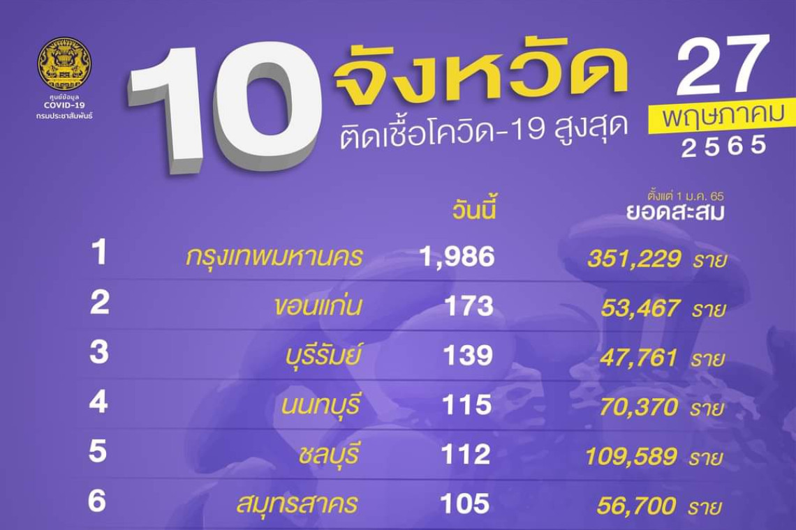 27 พ.ค.2565 ศูนย์ข้อมูลโควิด-19 รายงานสถานการณ์โรคติดเชื้อไวรัสโควิด-19 ข้อมูล ณ วันที่ 27 พ.ค.65 เวลา 01.00 น. พบผู้ติดเชื้อรายใหม่ 75 จังหวัด มีเพียงจังหวัด ลำปาง ลำพูน และพังงา ที่วันนี้ไม่พบผู้ติดเชื้อรายใหม่ โดย 10 อันดับจังหวัดติดเชื้อสูงสุด พบว่ากทม.ยังคงมีผู้ติดเชื้อรายใหม่อยู่ในอันดับ 1 อยู่ที่ 1,986 ราย ลดลงจากเมื่อวาน (จาก 2,017 ราย) อันดับ 2 ขอนแก่น 173 ราย (จาก 99 ราย) อันดับ 3 บุรีรัมย์ 139 ราย (จาก 145 ราย) อันดับ 4 นนทบุรี 115 ราย (จาก 115 ราย) อันดับ 5 ชลบุรี 112 ราย (จาก 88 ราย) อันดับ 6 สมุทรสาคร 105 ราย (จาก 110 ราย) อันดับ 7 มหาสารคาม 93 ราย (จาก 55 ราย) อันดับ 8 สมุทรปราการ 87 ราย (จาก 91 ราย) อันดับ 9 นครราชสีมา 81 ราย (จาก 55 ราย) อันดับ 10 ชัยภูมิ 78 ราย (จาก 72 ราย) ทั้งนี้ พบมี 6 จังหวัดที่พบผู้ติดเชื้อรายใหม่เกินร้อย โดยสูงที่สุดที่) ภาคกลาง 3 จังหวัด (จาก 22 จังหวัด) ตามด้วยภาคตะวันออกเฉียงเหนือ 2 จังหวัด (จาก 20 จังหวัด) ภาคตะวันออก 1 จังหวัด (จาก 7 จังหวัด) ส่วนภาคตะวันตก ภาคใต้ และภาคเหนือ ที่วันนี้ไม่พบผู้ติดเชื้อรายใหม่เกิน 100 ราย สำหรับจังหวัดที่ไม่พบผู้ป่วยรายใหม่ คือ จังหวัดลำปาง และลำพูน