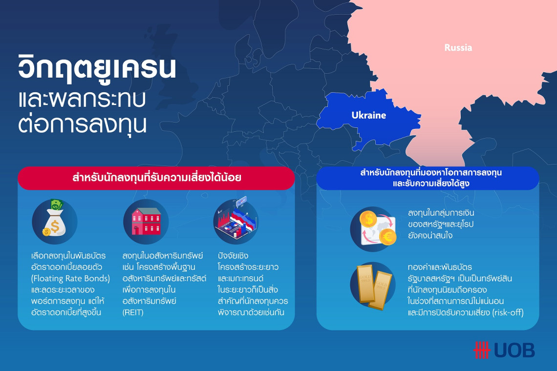 นายยุทธชัย เตยะราชกุล รองกรรมการผู้จัดการใหญ่บุคคลธนกิจ ธนาคารยูโอบี ประเทศไทยเปิดเผยว่า ในช่วงเวลาที่ความตึงเครียดระหว่างรัสเซียและยูเครนยังคงยืดเยื้ออย่างต่อเนื่อง สินทรัพย์ทางการเงินเกิดแรงเทขาย ความผันผวนเพิ่มขึ้นในสินทรัพย์เสี่ยง นักลงทุนทั่วโลกต่างพยายามทำความเข้าใจผลกระทบที่เกิดขึ้นในตลาด สถานการณ์ที่อาจเกิดขึ้นกับความขัดแย้งที่กำลังดำเนินอยู่ เห็นได้ชัดเจนว่าผลกระทบส่วนใหญ่จะเกิดกับรัสเซีย เนื่องจากพันธมิตรชาติตะวันตกส่วนใหญ่ มีมาตรการคว่ำบาตรต่อบริษัทในรัสเซีย สถาบันการเงิน และธนาคารกลาง ผู้ได้รับผลกระทบรองลงมาคือ ยุโรป เนื่องจากยุโรปต้องพึ่งพาน้ำมันและะก๊าซจากรัสเซีย ซึ่งมีแนวโน้มที่จะทำให้อัตราเงินเฟ้อเพิ่มขึ้น และเศรษฐกิจชะลอตัวในประเทศแถบยุโรป
