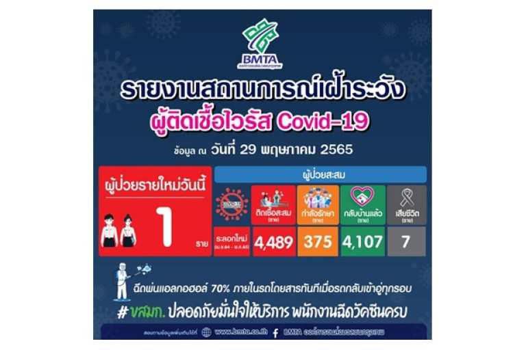 เพจองค์การขนส่งมวลชนกรุงเทพ โพสต์ระบุว่า ประกาศคณะทำงานศูนย์ปฏิบัติการภาวะฉุกเฉินโรคติดเชื้อไวรัส โคโรนา 2019 (COVID - 19) ประจำวันที่ 29 พฤษภาคม 2565 พบพนักงานติดเชื้อฯ จำนวน 1 ราย ติดเชื้อสะสม 4,489 ราย กำลังรักษา 375 ราย กลับบ้านแล้ว 4,107 ราย เสียชีวิตสะสม 7 ราย