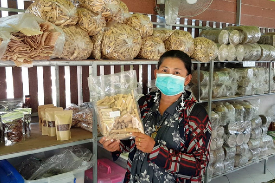 และปลีกล้วยก็นำมาตากแห้ง ผสมกับสมุนไพรขิง-กระชาย แปรรูปเป็น “ชาปลีตอง” ชงดื่มบำรุงน้ำนม รักษาโรคกระเพาะอาหารอักเสบ ช่วยลดน้ำตาลในเลือด กระตุ้นระบบการย่อยอาหาร ลดจุกเสียดแน่นเฟ้อ ช่วยบำรุงตับ ไต หัวใจ กระดูก ปรับสมดุลความดันโลหิต ส่วนยางกล้วยที่ดูเหมือนไร้ค่า ทำให้เสื้อผ้าเลอะเทอะ ซักออกยาก แต่ด้วยคุณสมบัตินี้เอง จึงนำมาใช้เพ้นท์ผ้า สร้างสรรค์งานศิลปะ ส่งเสริมกิจกรรมท่องเที่ยวชุมชน นอกจากนี้ยังแปรรูป “มะยงชิด-ละมุดอบแห้ง” อร่อยแบบธรรมชาติ ไร้สารเจือปน รสหวาน หนึบ เคี้ยวเพลิน ใครกินก็ติดใจ