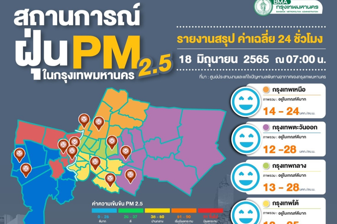ศูนย์ประสานงานและแก้ไขปัญหามลพิษทางอากาศในกรุงเทพมหานคร รายงานสถานการณ์ฝุ่นละอองขนาดไม่เกิน 2.5 ไมครอน (PM 2.5) ของสถานีตรวจวัดคุณภาพอากาศของกรุงเทพมหานคร ประจำวันเสาร์ที่ 18 มิถุนายน พ.ศ. 2565 เวลา 07.00 น. ค่าเฉลี่ย 24 ชั่วโมง ของฝุ่นละอองขนาดไม่เกิน 2.5 ไมครอน (PM2.5)