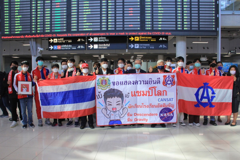 เมื่อเวลา 08.30น. วันที่ 19 มิ.ย.65 ที่อาคารผู้โดยสารขาเข้า ท่าอากาศยานสุวรรณภูมิ ภราดา ดร.อาวุธ ศิลาเกษ ผู้อำนวยการโรงเรียนอัสสัมชัญ กรุงเทพ พลเรือเอก ประพฤติพร อักษรมัต นายกสมาคมอัสสัมชัญ ดร.ธะนาชัย ธีรพัฒนวงศ์ นายกสมาพันธ์สมาคมศิษย์เก่า คณะเซนต์คาเบรียลแห่งประเทศไทย พร้อมคณะ รวมทั้งผู้ปกครอง เดินทางมาให้การต้อนรับ คณะนักเรียนไทย ชั้นมัธยมศึกษา จากโรงเรียนอัสสัมชัญ กรุงเทพมหานคร ที่เดินทางกลับมาถึงประเทศไทย ด้วยสายการบิน กาตาร์แอร์เวย์ เที่ยวบิน QR 830 หลังจากไปคว้าแชมป์โลก สร้างดาวเทียมจำลอง ที่สหรัฐอเมริกา ในการแข่งขัน Annual CANSAT Competition 2022 ซึ่ง เป็นการแข่งขันสร้างดาวเทียมจำลองที่มีขนาดเล็กจิ๋วเท่ากระป๋องเครื่องดื่ม หรือ ที่เรียกว่า “CANSAT” ได้อันดับ 1 และอันดับ 7 จาก จำนวนผู้เข้าร่วมในรอบสุดท้าย 23 ทีม 11 ประเทศ 4 ทวีป ทั่วโลก ณ สถาบันโพลีเทคนิค และ มหาวิทยาลัยรัฐเวอร์จิเนีย เมืองแบล็กส์เบิร์ก รัฐเวอร์จิเนีย ประเทศสหรัฐอเมริกา เมื่อ 12 มิถุนายน 2565
