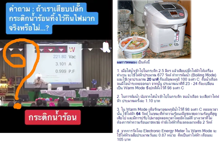 ในคลิป วิทยากรได้เสียบกระติกน้ำร้อนไฟฟ้า เข้ากับปลั๊กไฟ แล้วก็มีตัวเลขการใช้พลังงานขึ้นมาบนจอด้านหลัง สังเกตตัวเลขวัตต์ ได้ 6 ร้อยกว่าๆ แล้ววิทยากรก็บอกทำนองว่า เห็นมั้ยว่ากระติกน้ำร้อนกินไฟสูงมาก เป็นครึ่งหนึ่งของเครื่องปรับอากาศเลย หรือประมาณว่า 2 กระติกน้ำร้อนกินไฟเท่ากับแอร์หนึ่งเครื่อง ! ... นักเรียนจึงควรจะช่วยกันถอดปลั๊กกระติกน้ำร้อน ในโรงเรียน เวลาไม่ได้ใช้