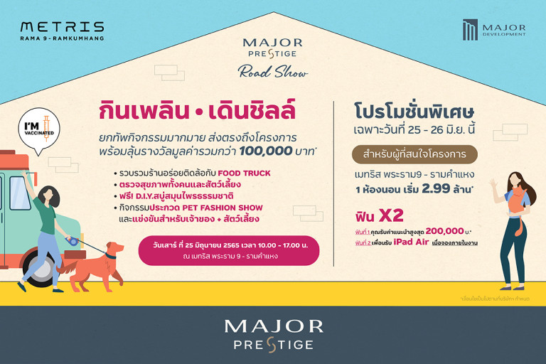 เมเจอร์ ดีเวลลอปเม้นท์ ผู้นำอันดับ 1 ในตลาดคอนโดมิเนียมเลี้ยงสัตว์ได้ (Pet-Friendly Residences) ยกทัพกิจกรรมพิเศษเพื่อลูกบ้านและสัตว์เลี้ยง รวมถึงผู้สนใจคอนโดเลี้ยงสัตว์ได้ จัดงาน “กินเพลิน เดินชิลล์” ภายใต้แคมเปญ Major Prestige Roadshow รวบรวมร้านค้า โรงพยาบาลชั้นนำ และกิจกรรมมากมาย มาให้ฟินกันอย่างต่อเนื่องช่วงวันหยุด ส่งตรงถึงโครงการ “เมทริส พระราม 9–รามคำแหง” ในวันเสาร์ที่ 25 มิ.ย.65 รับบริการฟรี! ตรวจสุขภาพพร้อมปรึกษาปัญหาทั้งคนและสัตว์เลี้ยง อิ่มอร่อยไปกับร้าน Food Truck เพลิดเพลินไปกับกิจกรรม D.I.Y. สบู่สมุนไพรธรรมชาติ และพบกับสินค้าราคาพิเศษมากมาย ทั้งนี้ ในงานยังมีไฮไลท์พิเศษสำหรับสัตว์เลี้ยงกับกิจกรรมประกวด Pet Fashion Show และความสามารถของน้องหมาและน้องแมว ลุ้นรับรางวัลมูลค่ารวมกว่า 100,000 บาท