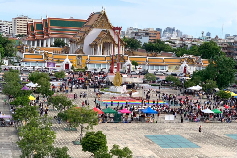 (24 มิ.ย.65) เวลา 16.50 น. ผู้สื่อข่าวรายงาน บรรยากาศลานคนเมือง หน้าศาลาว่าการกทม.(เสาชิงช้า) มีผู้ชุมนุมทยอยเข้าบริเวณลานที่จัดแบ่งพื้นที่ไว้ตามประกาศกรุงเทพมหานคร ซึ่งเป็นวันแรกที่ กทม. โดยผู้ว่าฯ ชัชชาติ สิทธิพันธุ์ ออกประกาศให้ลานคนเมืองเป็น 1 ใน 7 สถานที่เพื่อใช้สำหรับการชุมนุมสาธารณะ โดยสำนักงานเขตพระนครเจ้าของพื้นที่ได้จัดเจ้าพนักงานดูแลการชุมนุม พร้อมอำนวยความสะดวกและความปลอดภัยในการใช้พื้นที่ให้กับผู้เข้าร่วมการชุมนุมตามความเหมาะสม มีการเตรียมพร้อมรถจากสำนักป้องกันและบรรเทาสาธารณภัย เจ้าหน้าที่เทศกิจ ประสานเจ้าหน้าท่ีตำรวจดูแลความสงบเรียบร้อยพื้นที่ชุมนุมด้วย