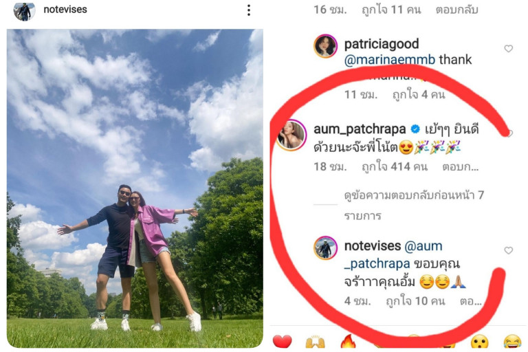 "อั้ม พัชราภา" นางเอกสาวก็เป็นหนึ่งที่ร่วมยินดีด้วย ล่าสุดก็โพสต์ข้อความ"เย้ๆๆยินดีด้วยนะพี่โน๊ต" กระทั่งหนุ่มโน๊ตวิเศษ"ตอบกลับว่า" ขอบคุณจร้าาา คุณอั้ม"