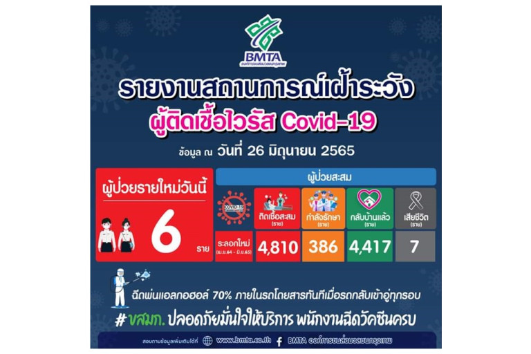 เพจองค์การขนส่งมวลชนกรุงเทพ โพสต์ระบุว่า ประกาศคณะทำงานศูนย์ปฏิบัติการภาวะฉุกเฉินโรคติดเชื้อไวรัส โคโรนา 2019 (COVID - 19) ประจำวันที่ 26 มิถุนายน 2565 พบพนักงานติดเชื้อฯ จำนวน 6 ราย ติดเชื้อสะสม 4,810 ราย กำลังรักษา 386 ราย กลับบ้านแล้ว 4,417 ราย เสียชีวิตสะสม 7 ราย