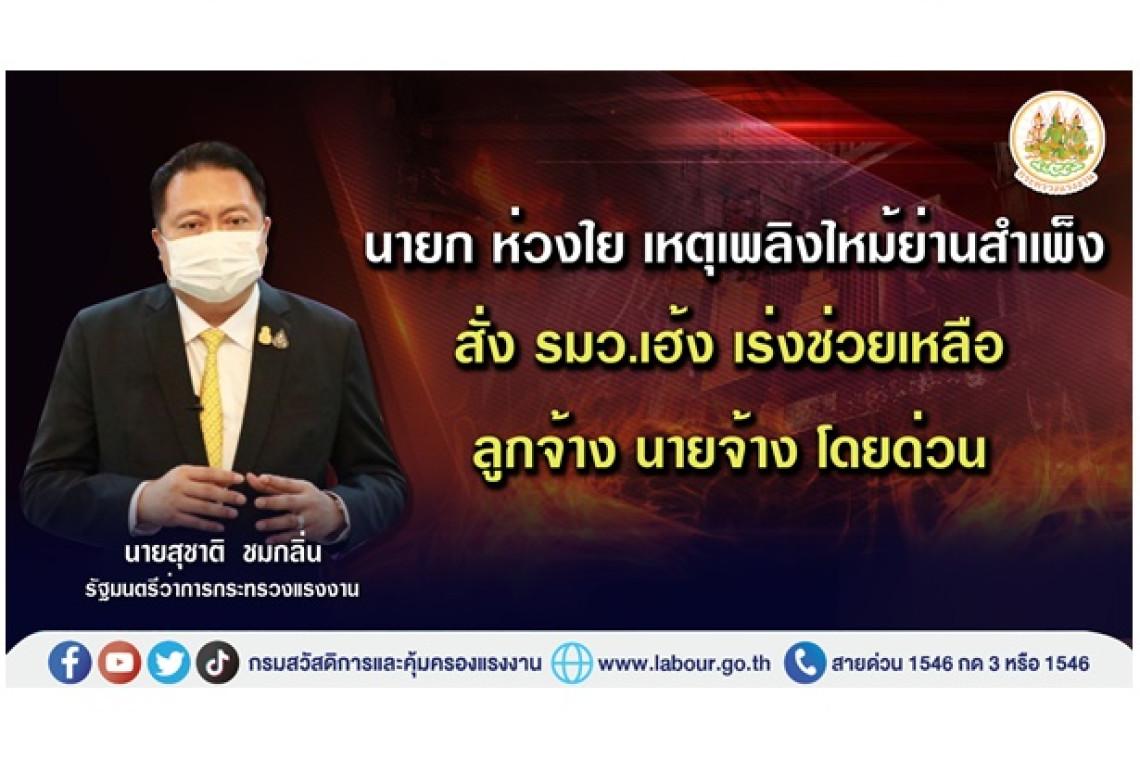 นายกฯห่วงใย เหตุเพลิงไหม้อาคารพาณิชย์ย่านสำเพ็ง ถนนราชวงศ์ กำชับกระทรวงแรงงานเร่งตรวจสอบช่วยเหลือลูกจ้าง นายจ้างอย่างเร่งด่วน รัฐมนตรีว่าการกระทรวงแรงงาน สั่งการ กรมสวัสดิการและคุ้มครองแรงงาน ร่วมกับหน่วยงานในสังกัดกระทรวงแรงงาน ลงพื้นที่ตรวจสอบข้อเท็จจริงเพิ่มเติมพร้อมช่วยเหลือให้ได้รับสิทธิความคุ้มครองตามกฎหมาย