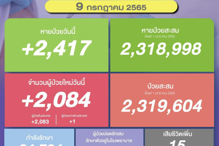 วันที่ 9 ก.ค.2565 ศูนย์ข้อมูล COVID-19 รายงานยอดผู้ติดเชื้อโควิด-19 รายใหม่จำนวน 2,084 ราย ทำให้ยอดผู้ป่วยสะสมตั้งแต่ 1 มกราคม 2565 มีจำนวน 2,319,604 ราย หายป่วยกลับบ้าน 2,417 ราย ทำให้ยอดหายป่วยสะสม ตั้งแต่ 1 มกราคม 2565 มีจำนวน 2,318,998 ราย ผู้ป่วยกำลังรักษา 24,734 ราย และเสียชีวิต 15 ราย รวมเสียชีวิตสะสมตั้งแต่ ปี 2563-ปัจจุบัน จำนวน 30,813 ราย