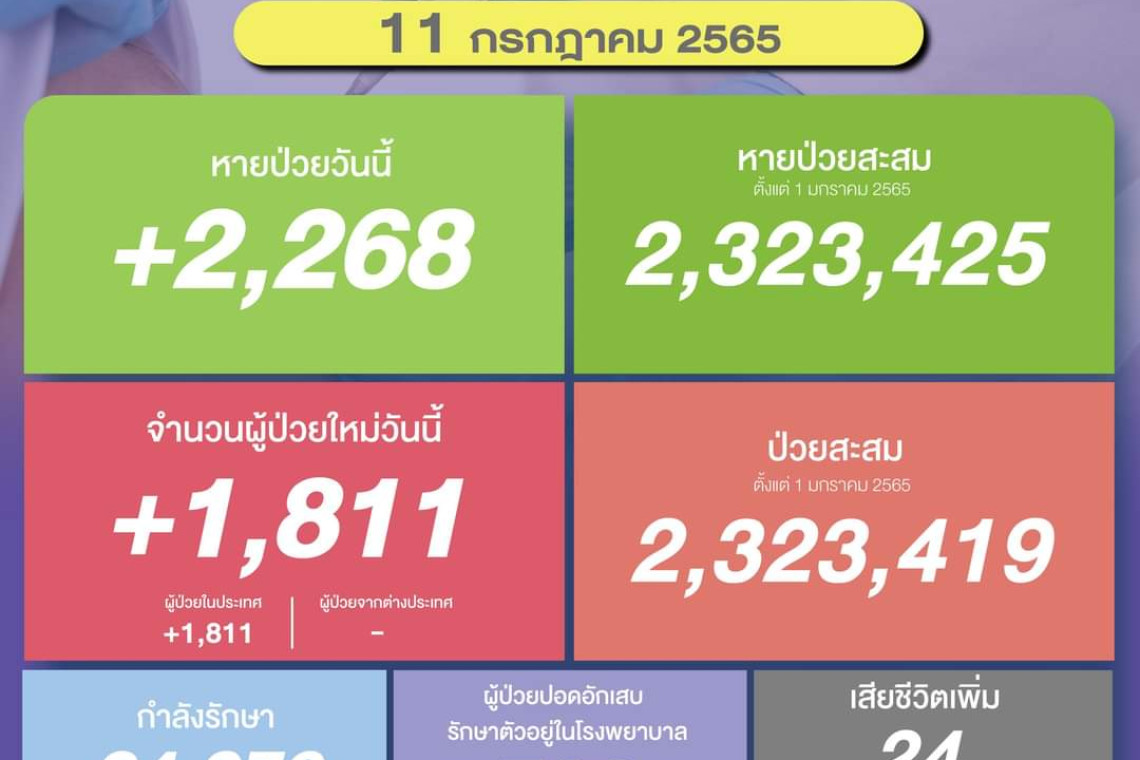 วันที่ 11 ก.ค.2565 ศูนย์ข้อมูล COVID-19 รายงานยอดผู้ติดเชื้อโควิด-19 รายใหม่จำนวน 1,811 ราย ทำให้ยอดผู้ป่วยสะสมตั้งแต่ 1 มกราคม 2565 มีจำนวน 2,323,419 ราย หายป่วยกลับบ้าน 2,268 ราย ทำให้ยอดหายป่วยสะสม ตั้งแต่ 1 มกราคม 2565 มีจำนวน 2,323,425 ราย ผู้ป่วยกำลังรักษา 24,076 ราย และเสียชีวิต 24 ราย รวมเสียชีวิตสะสมตั้งแต่ ปี 2563-ปัจจุบัน จำนวน 30,8359 ราย