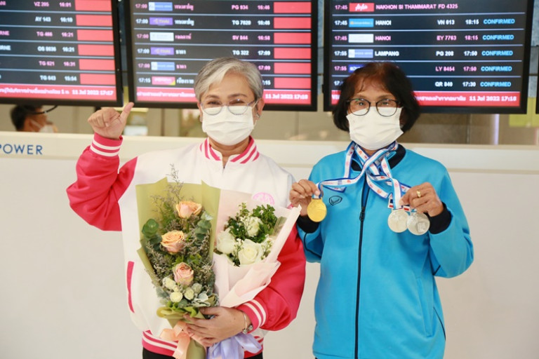 วันนี้ (11 ก.ค. 65) เวลา 17.00 น. ที่ท่าอากาศยานสุวรรณภูมิ นางสาวแรมรุ้ง วรวัธ รองปลัดกระทรวงการพัฒนาสังคมและความมั่นคงของมนุษย์ (รองปลัด พม.) พร้อมด้วย นางชวนชม จันทะวงษ์ รองอธิบดีกรมกิจการผู้สูงอายุ นางเฉลียวศรี ฉิมวงศ์ เลขาธิการสมาคมกรีฑาผู้สูงอายุไทย และคณะ ร่วมต้อนรับและแสดงความยินดีแก่ทีมกรีฑาสูงอายุไทยที่สามารถคว้า 2 เหรีญทอง และ 4 เหรียญเงิน จากการแข่งขันกรีฑาสูงอายุชิงแชมป์โลก 2022 ซึ่งมีนักกีฬาเข้าร่วมการแข่งขันจากทั่วโลกกว่า 100 ประเทศ ที่เมืองแทมเปเร ประเทศฟินแลนด์ ทั้งนี้ นางสมสง่า บุญนอก (ครูสมสง่า) อายุ 68 ปี ครูเกษียณอายุราชการจากโรงเรียนศรีบุญเรืองวิทยาคาร จังหวัดหนองบัวลำภู ได้รับเหรียญทองจากการแข่งขันกระโดดไกล รุ่นอายุ 65 - 69 ปี หญิง นับเป็นนักกีฬาผู้สูงอายุไทยคนแรกที่ได้รับเหรียญทองในประวัติศาสตร์จากการแข่งขันดังกล่าว และอีก 2 เหรียญเงินจากการแข่งขันเขย่งก้าวกระโดดและวิ่งข้ามรั้ว 80 เมตร รุ่นอายุ 65 - 69 ปี หญิง และนางธนภรณ์ อัศววงศ์เจริญ อายุ 44 ปี พนักงานเทศกิจ กรุงเทพมหานคร ได้รับเหรียญทองจากการแข่งขันเดิน 20 กิโลเมตร รุ่นอายุ 40 - 44 ปี หญิง และอีก 2 เหรียญเงินจากการแข่งขันเดิน 10 กิโลเมตร และ 5 กิโลเมตร รุ่นอายุ 40 - 44 ปี หญิง