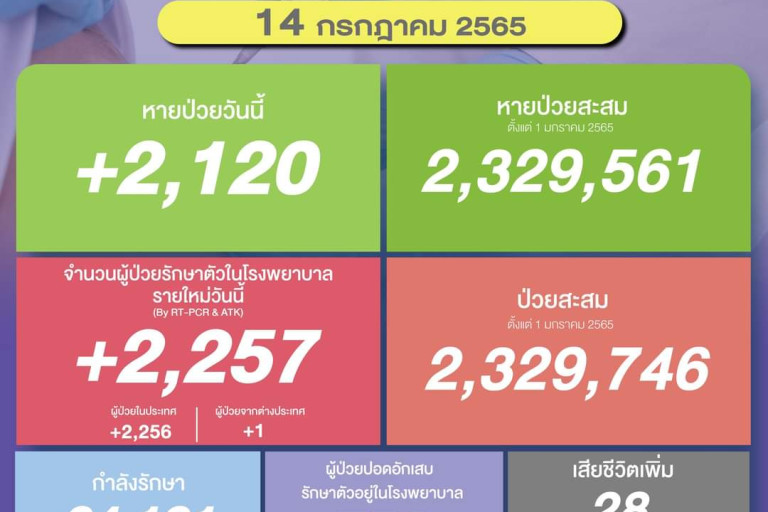 วันที่ 14 ก.ค.2565 ศูนย์ข้อมูล COVID-19 รายงานยอดผู้ติดเชื้อโควิด-19 รายใหม่จำนวน 2,257 ราย ทำให้ยอดผู้ป่วยสะสมตั้งแต่ 1 มกราคม 2565 มีจำนวน 2,329,746 ราย หายป่วยกลับบ้าน 2,120 ราย ทำให้ยอดหายป่วยสะสม ตั้งแต่ 1 มกราคม 2565 มีจำนวน 2,329,561 ราย ผู้ป่วยกำลังรักษา 24,191 ราย และเสียชีวิต 28 ราย รวมเสียชีวิตสะสมตั้งแต่ ปี 2563-ปัจจุบัน จำนวน 30,935 ราย