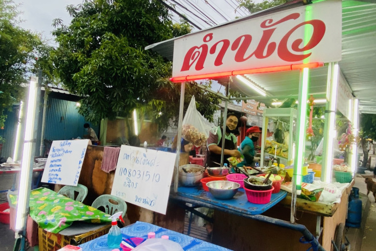 “ ในความอร่อยไม่ต้องพูดถึง ร้านเปิดไม่ถึง 20 นาที โต๊ะเต็ม ต้องยืนรอต่อคิวเข้าแถวยาวนับร้อยเมตร ความอร่อยเรื่องลือดังไปทั้่วทั้งจังหวัด และจังหวัดใกล้เคียง สมุทรสาคร นครปฐม ราชบุรี กรุงเทพมหานคร ต่างแห่กันมานั่งกินขายดีจนแม่ค้าเป็นลมคาครกส้มตำ “