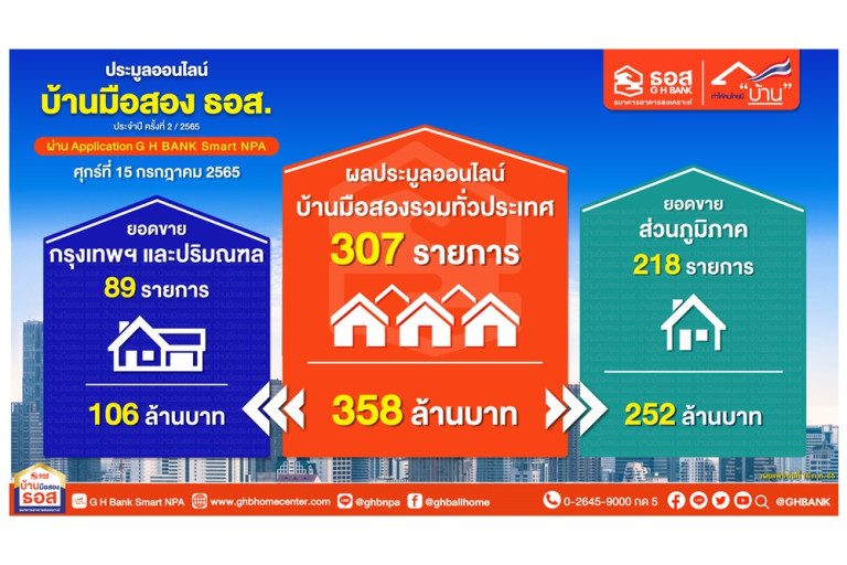 ธนาคารอาคารสงเคราะห์ (ธอส.) รายงานผลการจัดงานประมูลออนไลน์บ้านมือสอง ธอส. ประจำปี ครั้งที่ 2/2565ผ่าน Application : G H Bank Smart NPA ที่จัดขึ้นวานนี้ (15 ก.ค.65) ระหว่างเวลา 9.00-16.00 น.สามารถจำหน่ายบ้านมือสอง ธอส. ทั่วประเทศได้ 307 รายการ คิดเป็นจำนวนเงินรวม 358 ล้านบาท แบ่งเป็นทรัพย์ที่ตั้งอยู่ในพื้นที่กรุงเทพฯ และปริมณฑล 89 รายการ จำนวนเงิน 106 ล้านบาท และทรัพย์ในส่วนภูมิภาค 218 รายการ จำนวนเงิน 252 ล้านบาท โดยทรัพย์ที่ประมูลขายได้ในราคาต่ำที่สุด คือ ทรัพย์ประเภทคอนโดมิเนียม ขนาดเนื้อที่ 23.63 ตารางเมตร ในโครงการคูณเจริญคอนโดทาวน์ 2 อ.บางพลี จ.สมุทรปราการ ปิดประมูลในราคาเพียง 90,000 บาท เท่านั้น ส่วนทรัพย์ที่ประมูลขายได้ในราคาสูงสุด คือ ทรัพย์ประเภทคอนโดมิเนียม ขนาดเนื้อที่ 60.02 ตารางเมตร ในโครงการไบรท์ตั้นเพลส เขตบางกะปิ กรุงเทพฯ ปิดประมูลได้ในราคา 5,100,000 บาท เนื่องจากเป็นทรัพย์ที่ทำเลดี เดินทางได้ในหลายเส้นทางคมนาคม และใกล้แหล่งอำนวยความสะดวกมากมาย พิเศษ!! ผู้ชนะประมูลได้สิทธิ์ผ่อนดาวน์ดอกเบี้ย 0% นานสูงสุด 24 เดือน และสามารถเข้าอยู่อาศัยได้ในระหว่างผ่อนดาวน์เพียงชำระเงินประกันการเข้าอยู่อาศัยไม่ต่ำกว่า 1.5% ของราคาประมูลได้