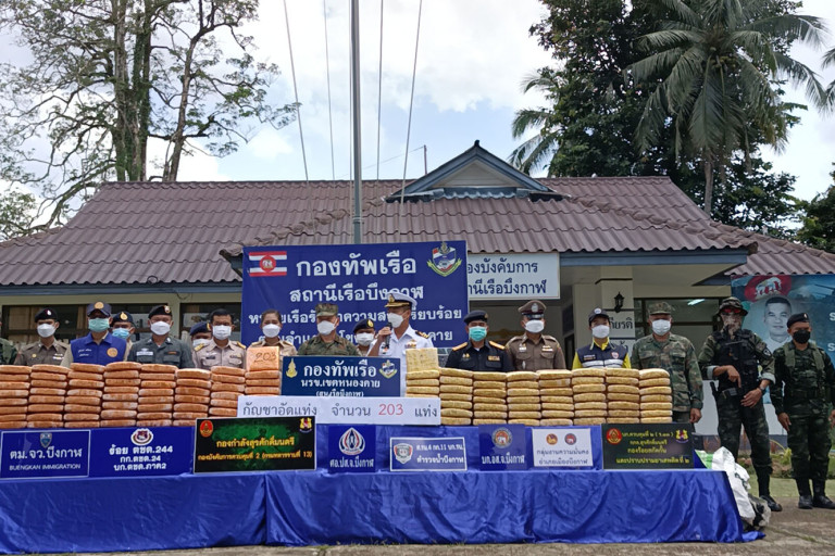จากกรณีเมื่อวันที่ 19 ก.ค.ผ่านมาที่หน่วยเรือรักษาความสงบเรียบร้อยตามลำแม่น้ำโขง สถานีเรือ นรข.บึงกาฬ น.อ.ราฆพ เทวะประทีบ ผบ.นรข.เขตหนองคาย มอบหมายให้ น.ท.สุรไกร รัตนกุสุมภ์ หน.ยก.นรข.เขตหนองคาย ร่วมกับพ.ต.ต.หญิง ชุลีกร ลิมวิเศษศักดิ์ สว.ตม.บึงกาฬ พ.ต.ต.วิษณุ จินาวงษ์ สว.ตำรวจน้ำ นายนายอธิภัทร อยู่คุ้มญาติ หน.ฝ่ายปราบปรามฯ ด่านศุลกากรบึงกาฬ น.ส.กมลนิตยกานต์ หาญคำหล้า ผู้ช่วยป้องกันจังหวัด นายภูมินทร์ ศรีโฉม ปลัดฝ่ายป้องกันอำเภอเมืองบึงกาฬ ร่วมกันแถลงจับกุม นายจิระ (นามสมมติ) อายุ 24 ปี ชาว กทม.นายราชา (นามสมมติ) อายุ 24 ปี ชาว จ.นนทบุรี และนายพงษา อายุ 26 ปี ชาว จ.อุดรธานี ของกลาง กัญชาแห้งอัดแท่ง 203 แท่งน้ำหนัก 203 กิโลกรัม ห่อหุ้มด้วยกระดาษฟอลย์สีทองและสีเหลือง รถยนต์บรรทุกขนาดเล็กด้านหลังทำเป็นตู้ทึบคล้ายรถส่งสินค้า ยี่ห้ออีซูซุ รุ่นดีแม็กซ์ สีบรอนซ์เงิน ทะเบียน 2 ฒช 9288 กรุงเทพมหานคร และโทรศัพท์มือถือ 3 เครื่อง จึงยึดไว้เป็นของกลางแจ้งข้อหา“ร่วมกันนำของต้องห้ามต้องกำกัดเข้ามาในราชอาณาจักรโดยไม่ผ่านพิธีการทางศุลกากร”